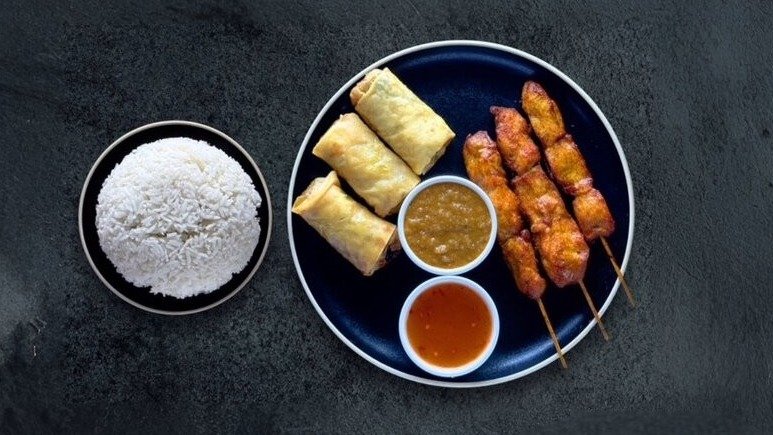 Menuen indeholder: 3 x kyllingespyd med jordnøddesauce 3 x hjemmelavede forårsruller med/uden kød 1 x dip