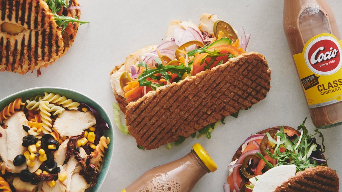 Byg selv bagel med valgfrit brød, protein, smørrelse, grønt og dressing samt valgfri vand.