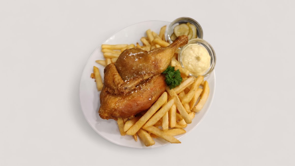Serveres med pommes frites, salat, en sodavand og salatmayonnaise.