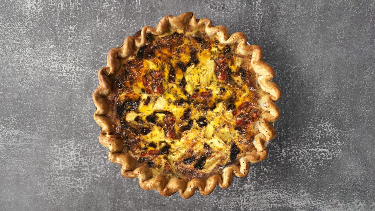 **Nyd vores håndlavede quiche, friskbagt i din egen ovn.** Denne middelhavsinspirerede quiche er fyldt med smag fra soltørrede tomater, artiskokker, søde peberfrugter, porre og mozzarellaost i en rig og krydret ægge- og flødefyldning, bagt i vores håndrullede signatur smørdej. Bag i forvarmet ovn ved 185 °C i 50-55 minutter, indtil skorpen er gyldenbrun, og midten er fast og gennembagt. Rækker til ca. 5 personer.