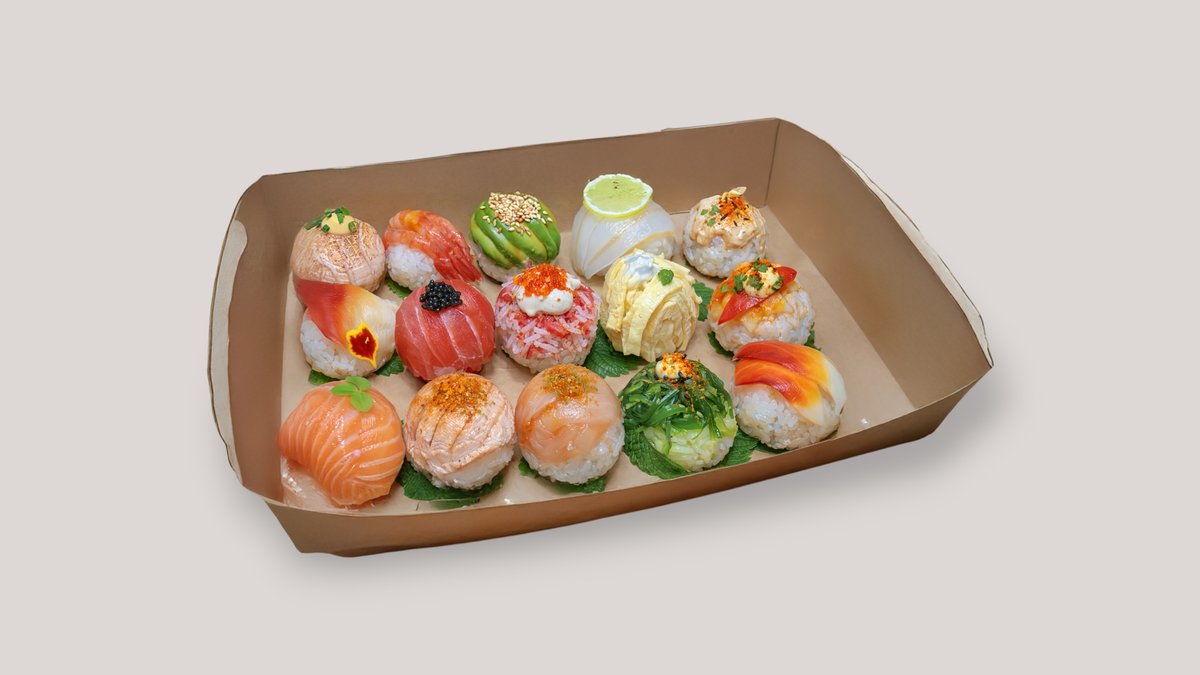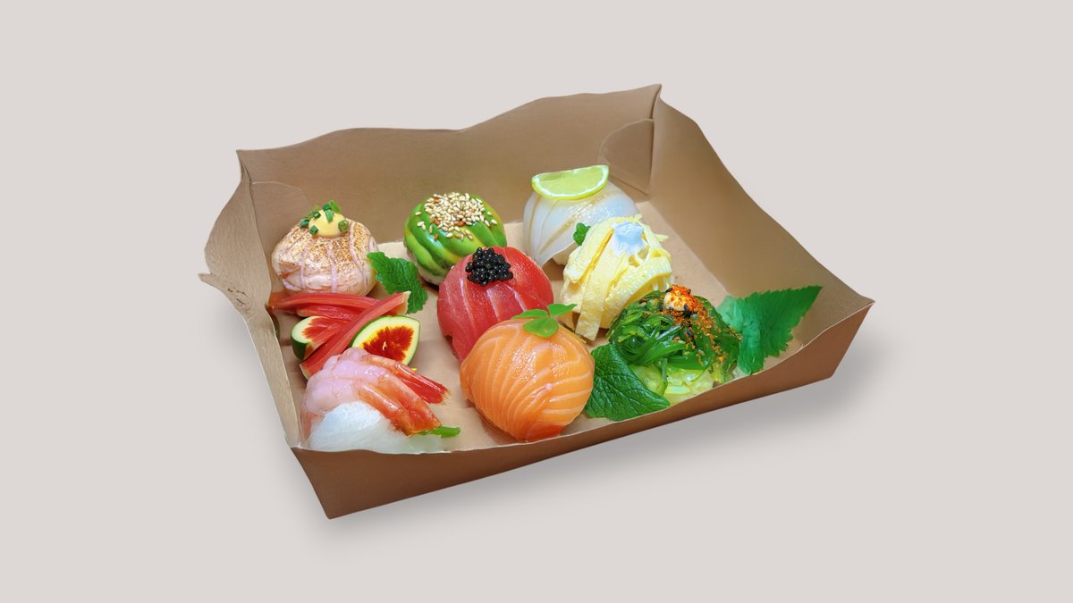 Forretter 1 x Edamamebønner Nigiri 2 x Laks 2 x Tun 2 x Reje Uramaki 4 x Alaska Kaburimaki 4 x Sunset kaburi