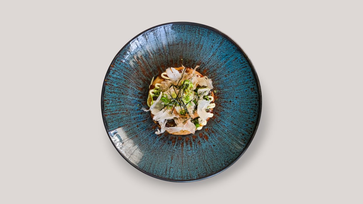 Japansk pandekage med fermenteret kål og katsoubushi. Toppes med tempura halibut rejer, guacamole, sprøde kartofler og puré af karameliserede løg.