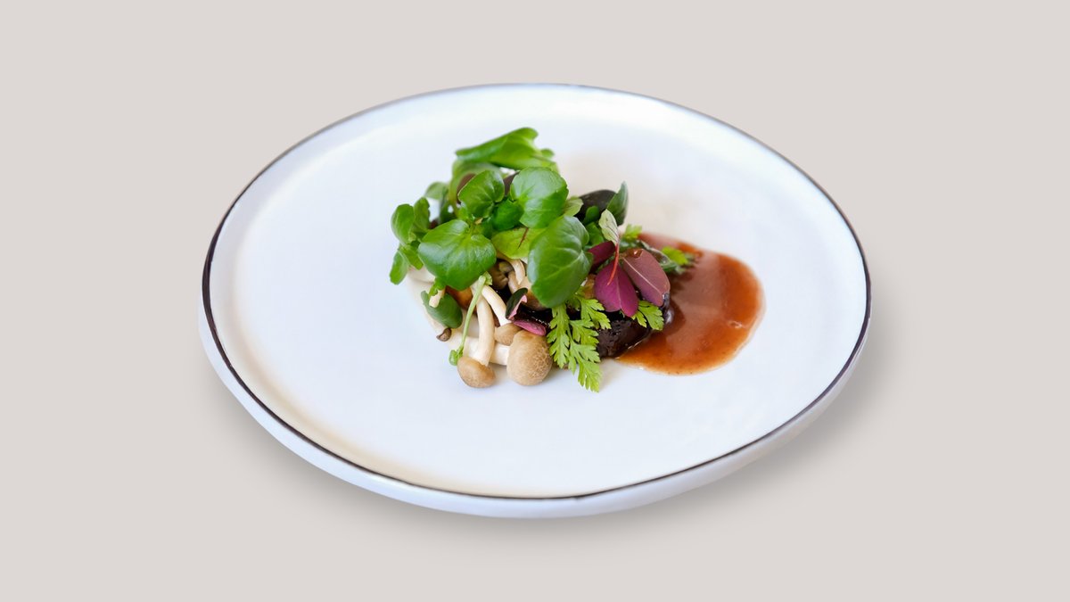 24 timers, langtidstilberedt svinemave, glaseret i hoisin sauce. Serveres med grillet grønkål og søde kartofler, puré af knoldselleri og espresso-teriyaki sauce.