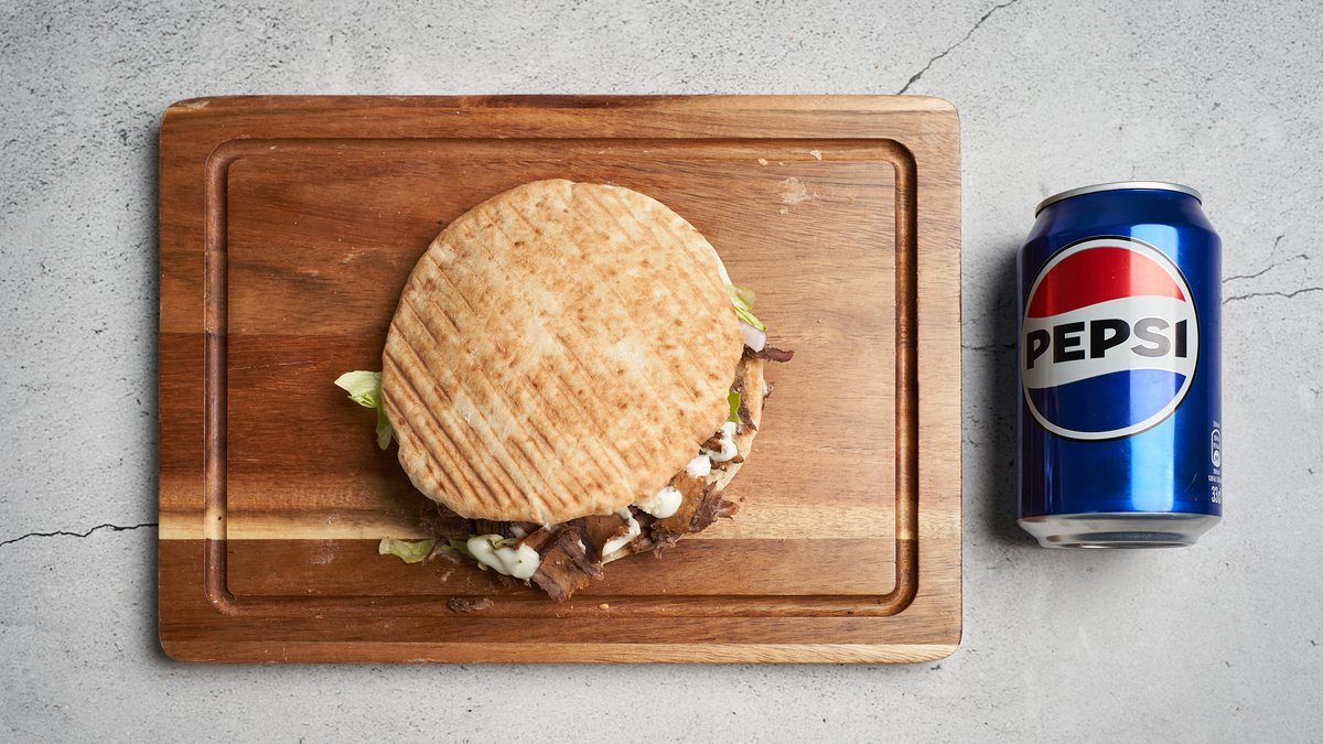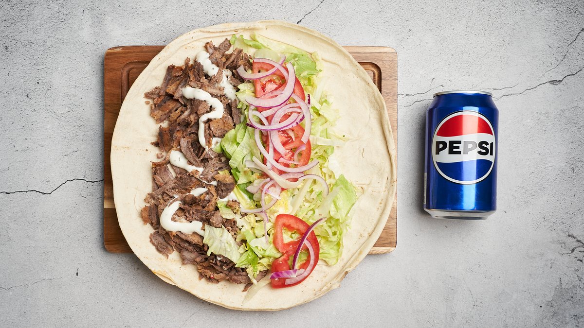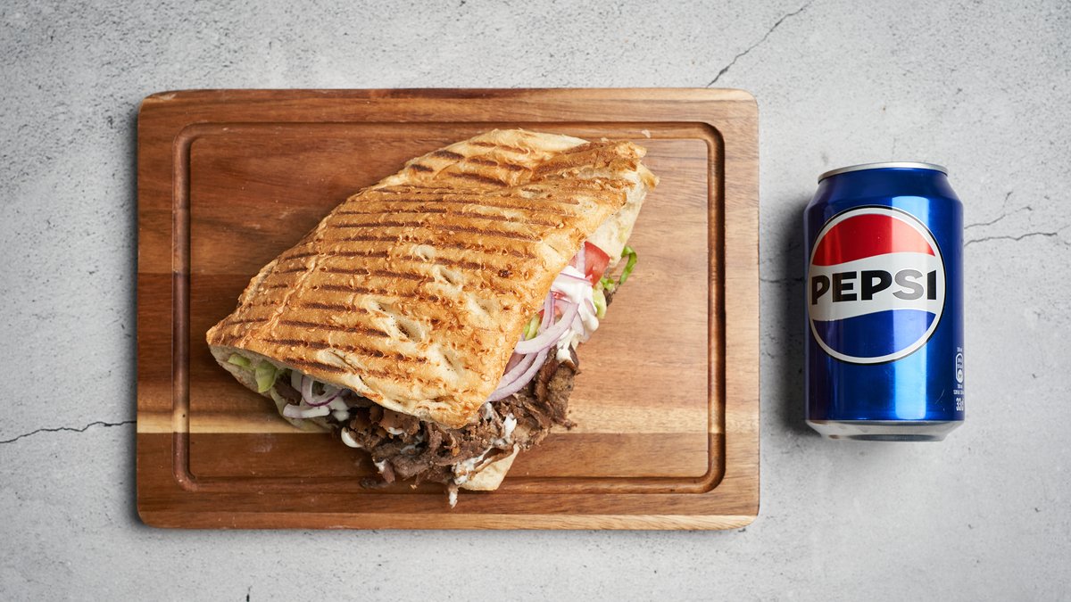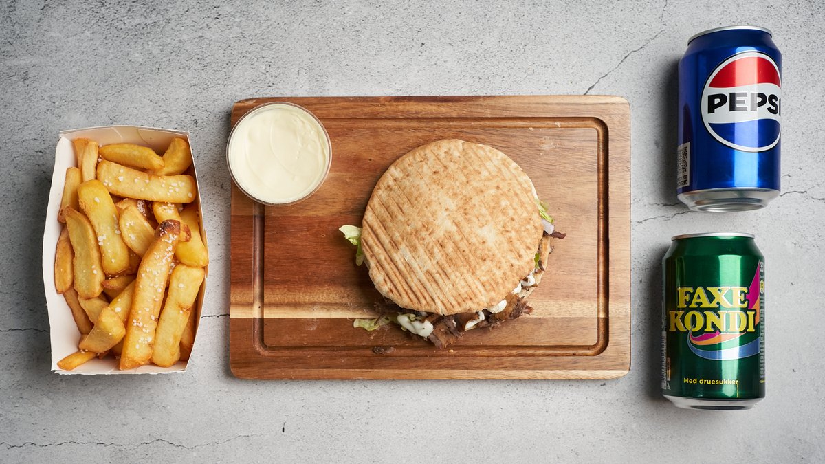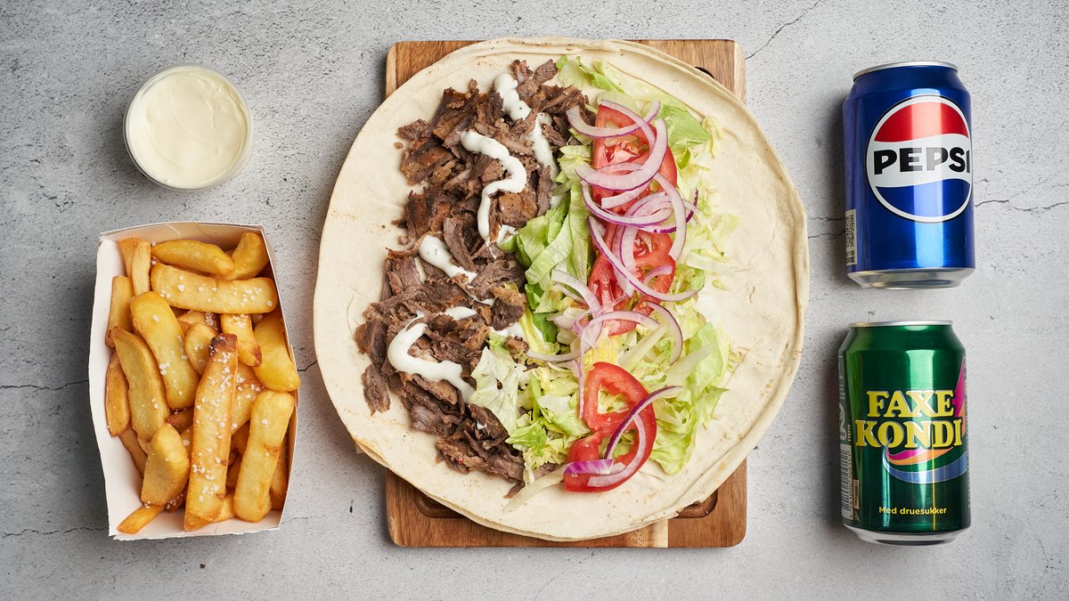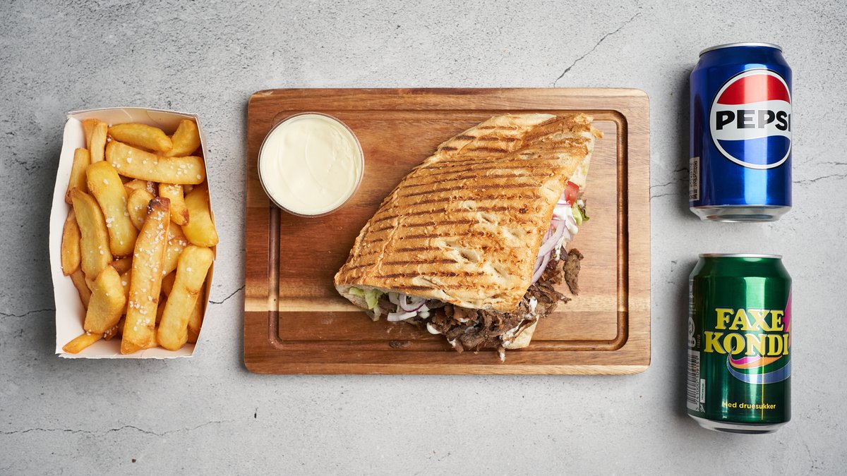Serveres i varmbrød med valgfrit protein, salat, løg, tomat og dressing. Serveres med pommes frites, mayonnaise og en 0,5 l sodavand.