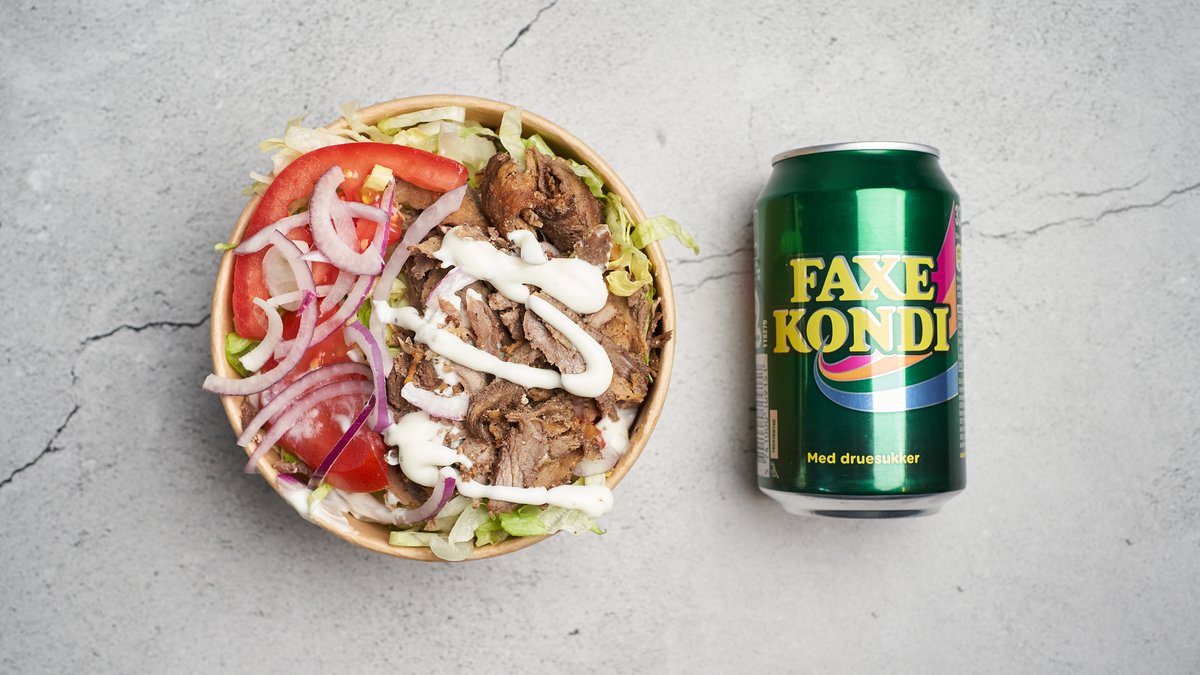 Kebab, salat, løg, tomat og dressing. Serveres med en valgfri sodavand.