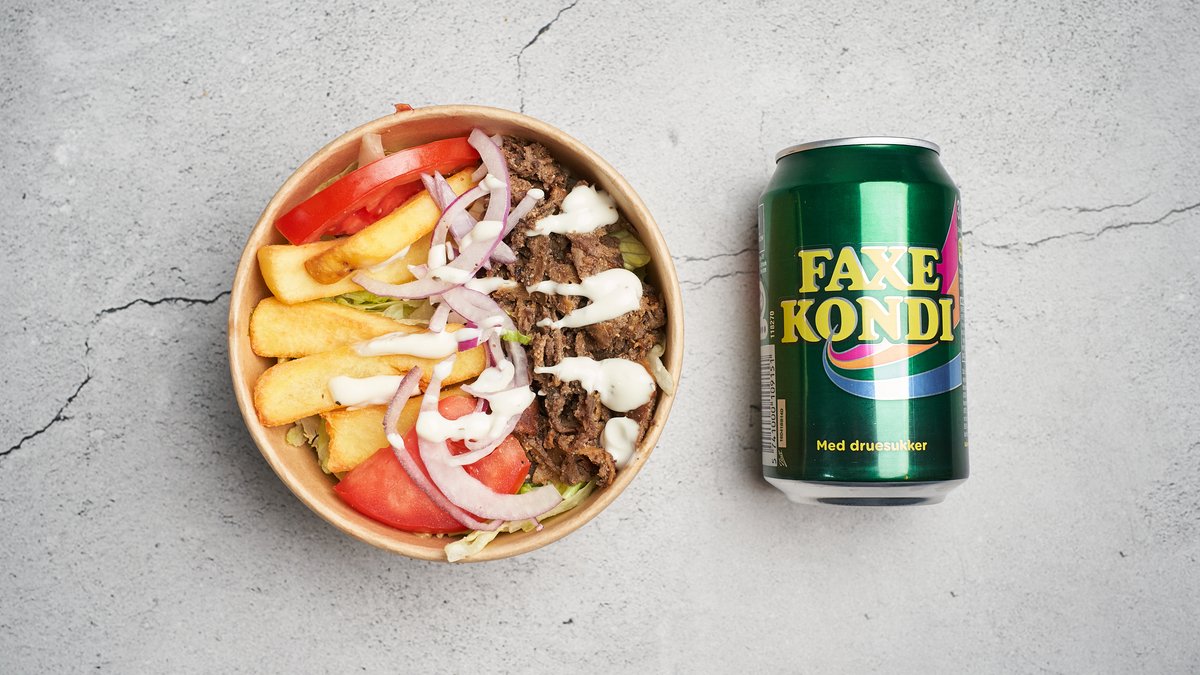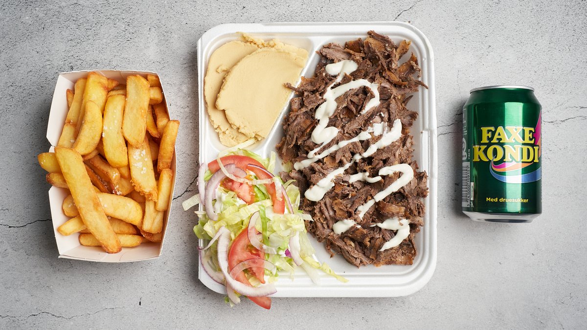 Kebab, pommes frites, salat, løg, tomat og dressing. Serveres med en valgfri sodavand.