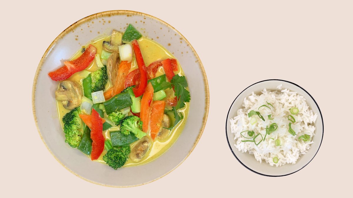 Vegan - Gul karry med grønt og tofu. Serveres med ris.