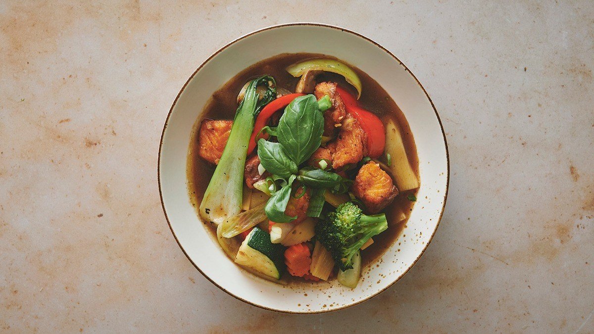 Spicy østerssauce med soya, basilikum og grønne peberkorn. Serveres med ris. Vælg mellem laks, rejer og and.