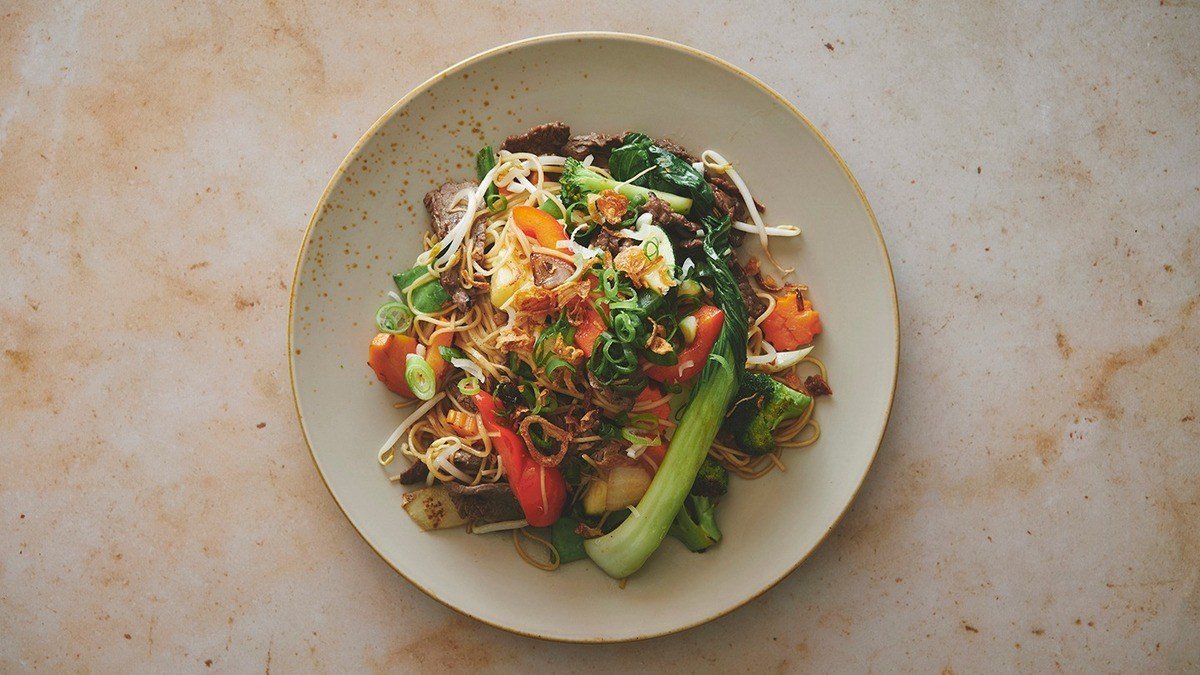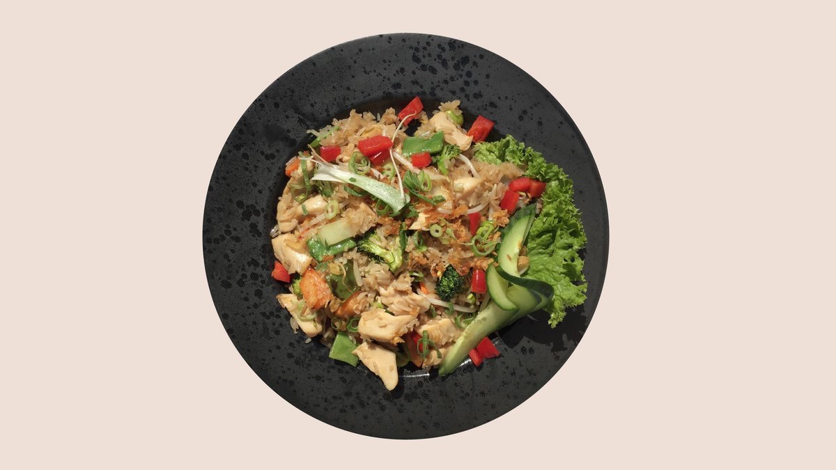 Stegte æggenudler med grønt. Vælg i mellem kylling eller oksekød.
