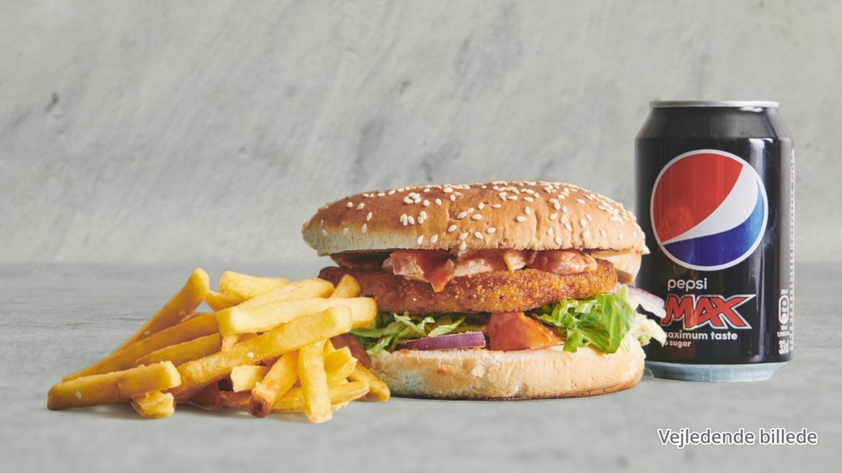 Kyllingeburger med pommes frites, salatmayonnaise og valgfri 0,33 l sodavand.