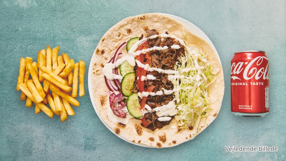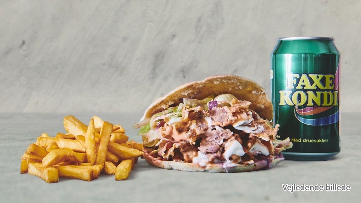 Valgfri pitabrød med pommes frites, salatmayonnaise og valgfri 0,33 l sodavand.