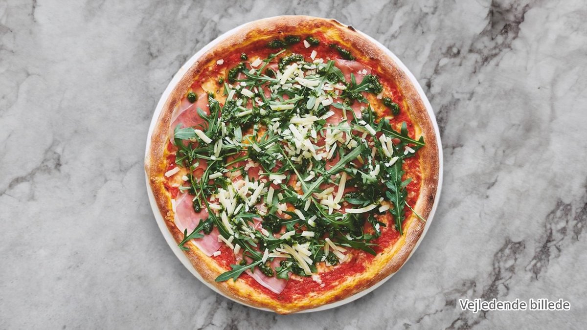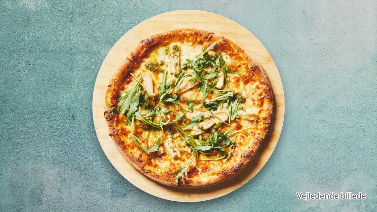 Tomatsauce, mozzarella, kylling, rucola og pesto.
