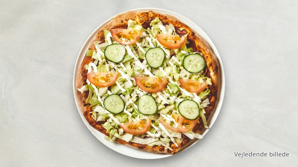 Tomatsauce, mozzarella, shawarma, salat og dressing.
