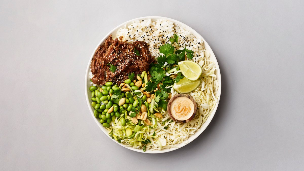 Vælg mellem et stykke brød eller en dessert samt en drikkevare. Lune ris, Kål, Edamame bønner, Porre, Beef teriyaki, Peanuts, Koriander, Sesam & Lime / Goma dressing & Kimchi dressing