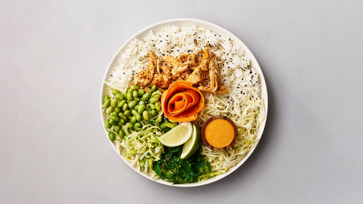 Lune ris, Pulled chicken, Kål, Edemame, Syltet gulerod, Porre, Tangsalat, Kimchi dressing, blandet sesamfrø og en lime båd