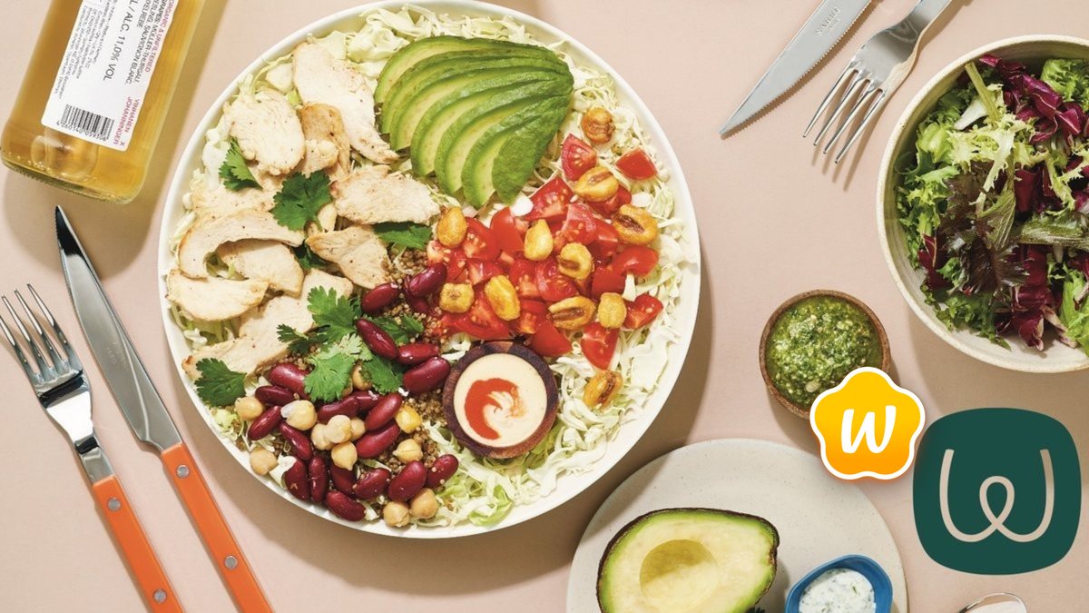 3 x Wedo falafel elller 1 x satay kyllingespyd, fuldkornspasta, søde kartofler, romaine, agurk, gulerødder og croutoner / Valgfri dressing