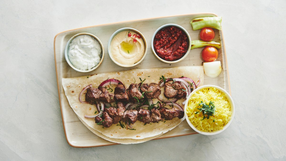 Valgfrie spyd serveret med tzatziki, hummus, chili og valgfri tilbehør.