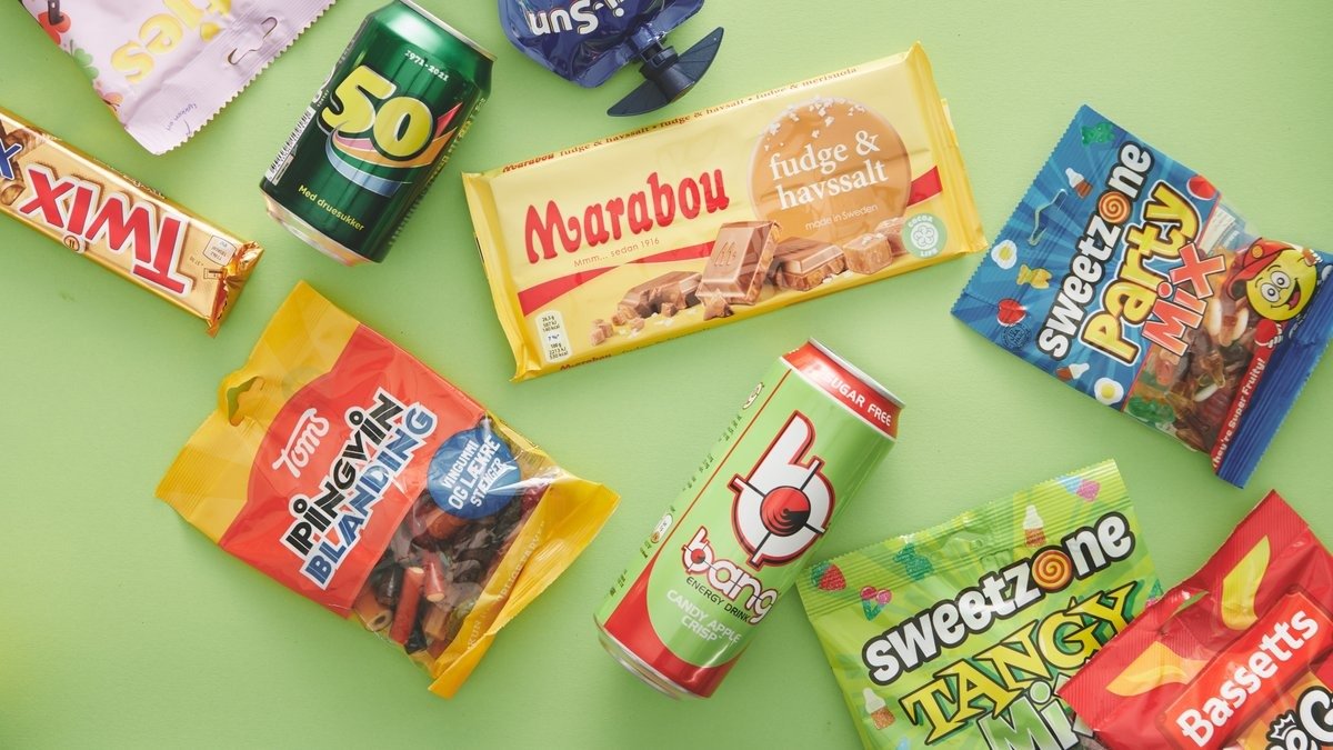 Bredt udvalg af slik, drikkevarer og kioskvarer