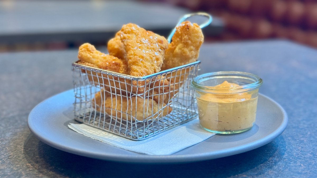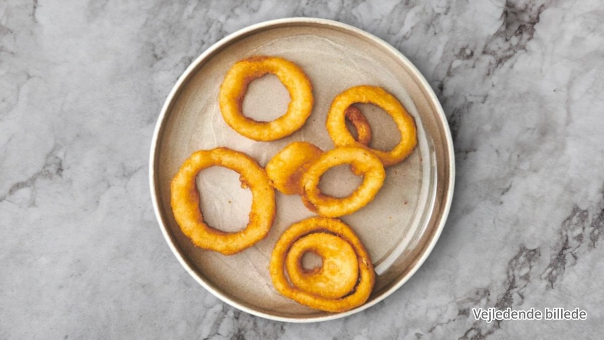 Ølpanerede løgringe med mayo.