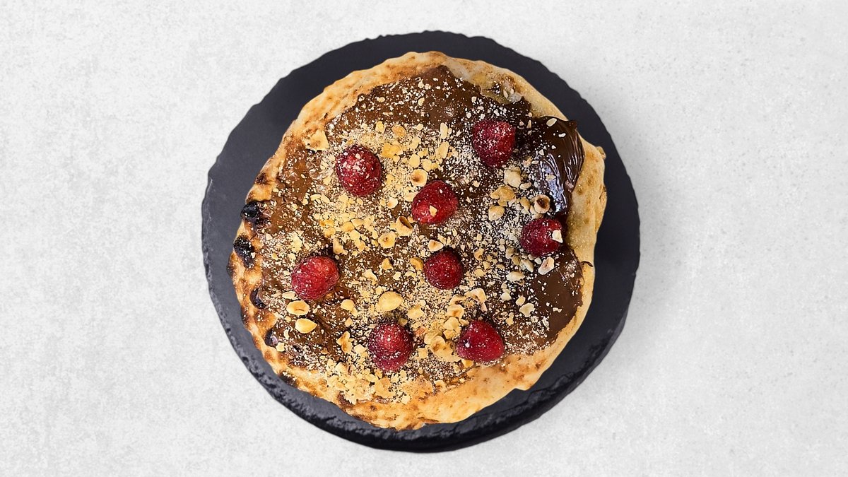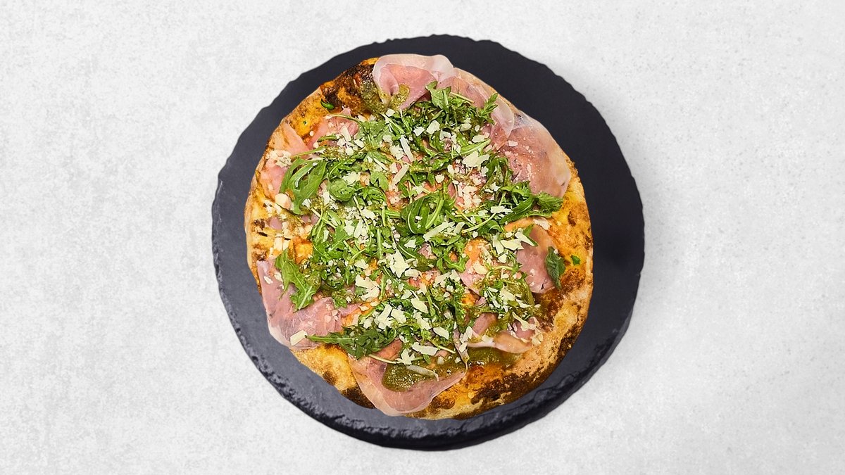 San Marzano tomatsauce, fior di latte ost, lufttørret parmaskinke, rukula, grana padano flager og genovesisk pesto.