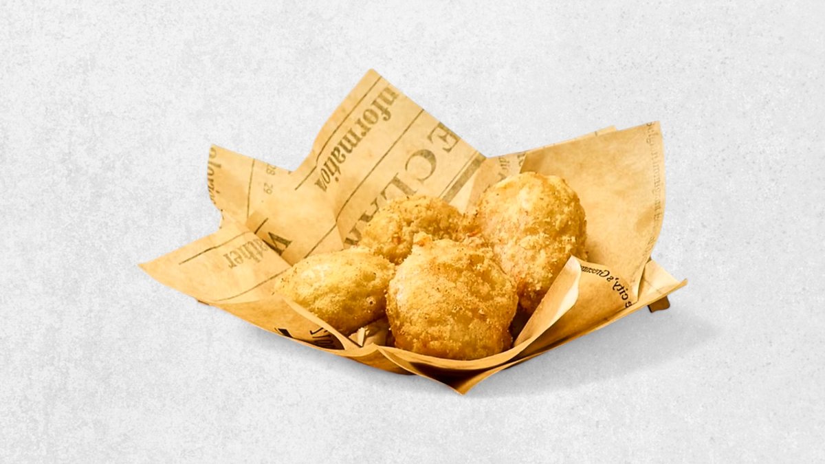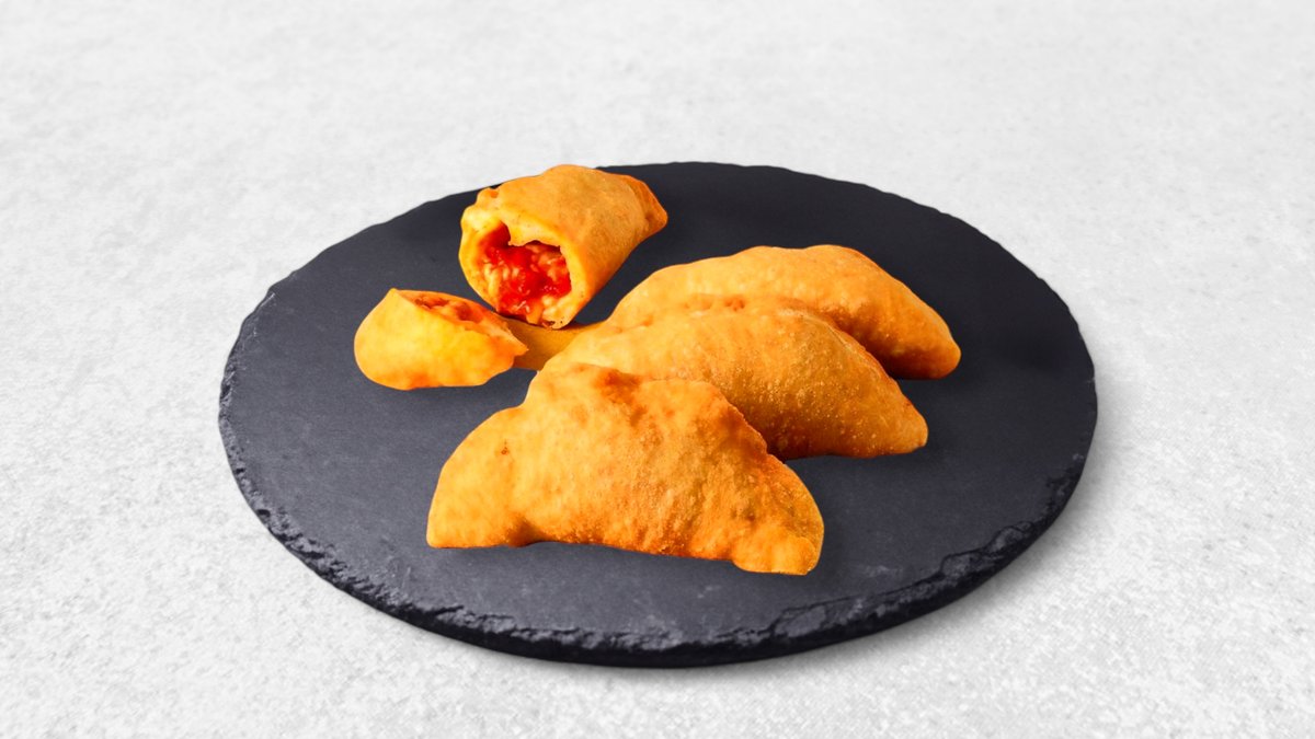 Friturestegt pizzadej med fyld af tomatsauce, mozzarellaost og skinke.