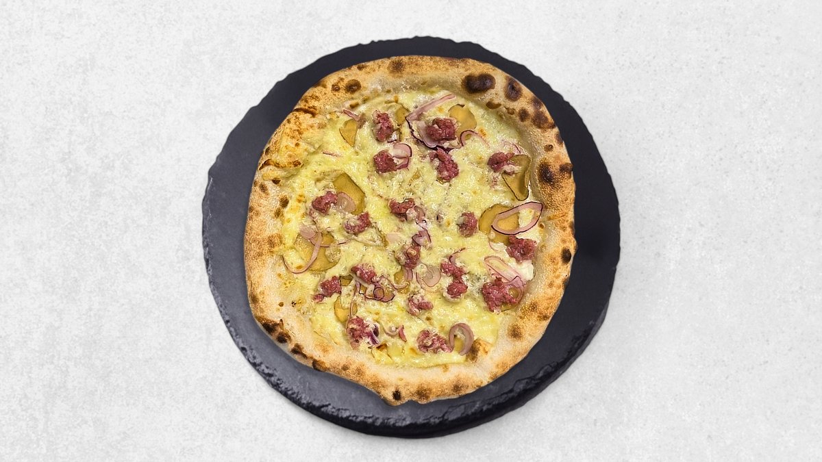 Gourmetpizza med trøffelcreme, mascarpone og salsiccia (italiensk pølse)
