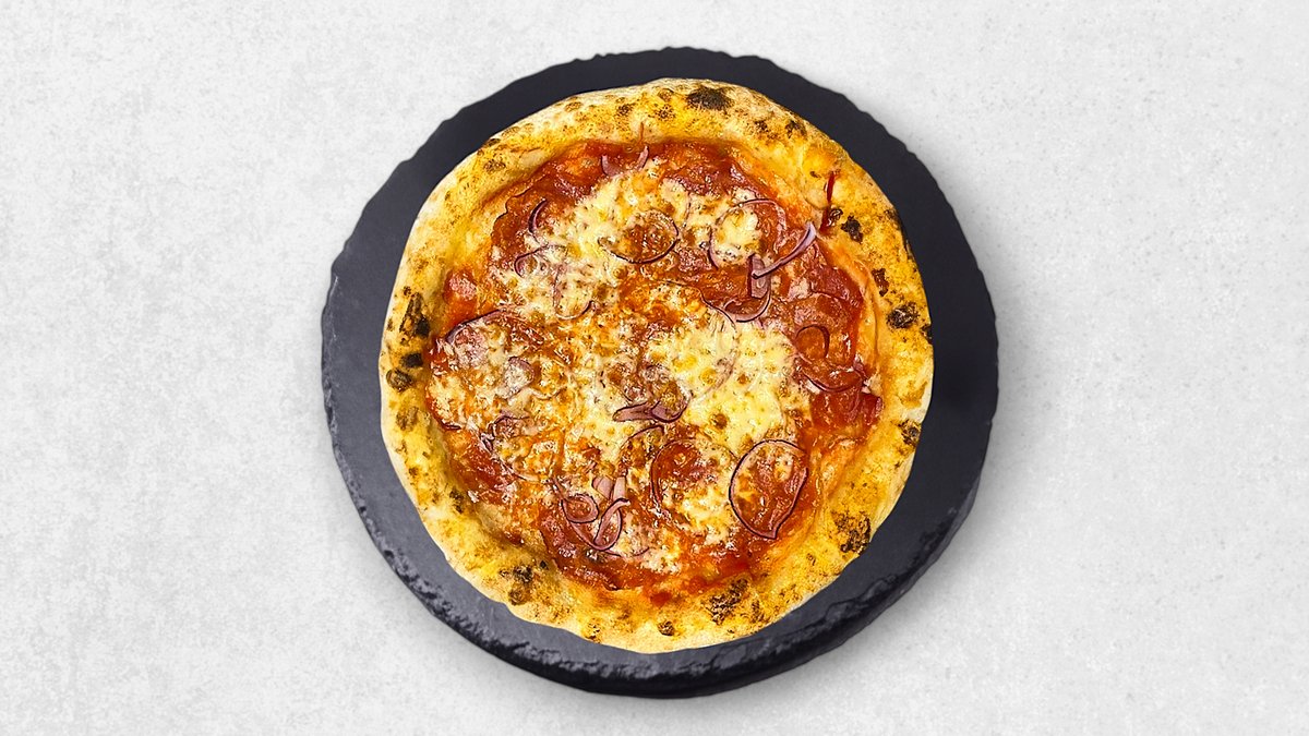 Tomatsauce, Mozzarella Ost, Med Ventricina (spicy salami) og rødløg.