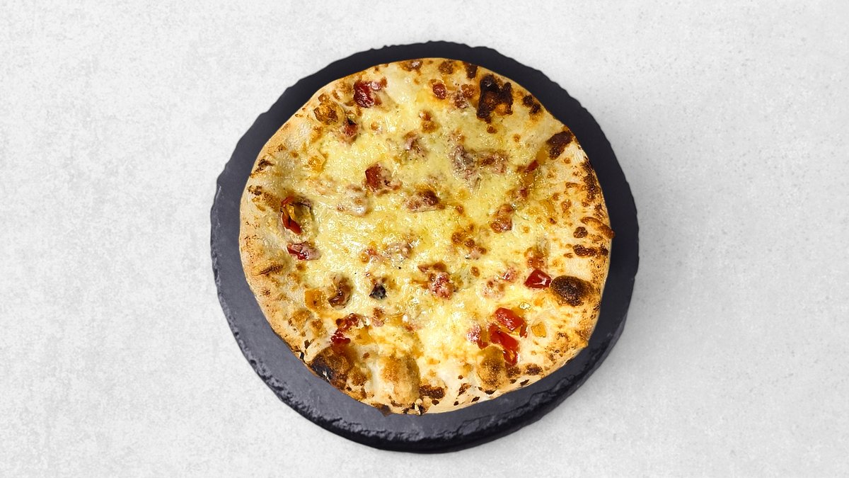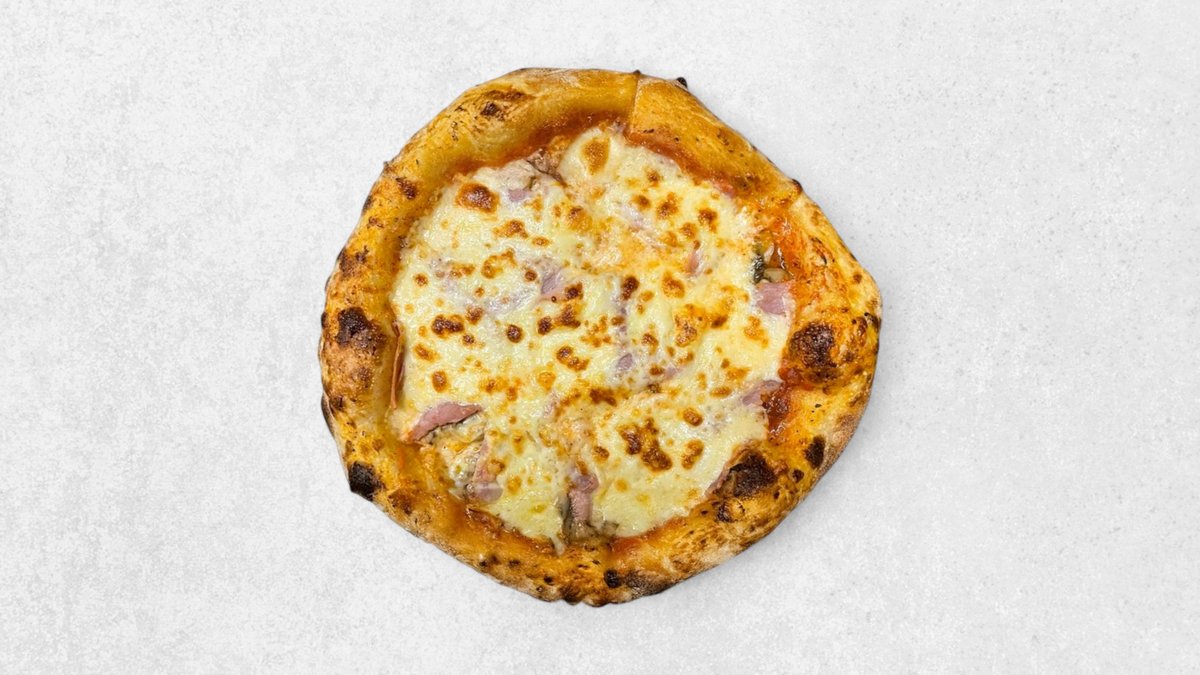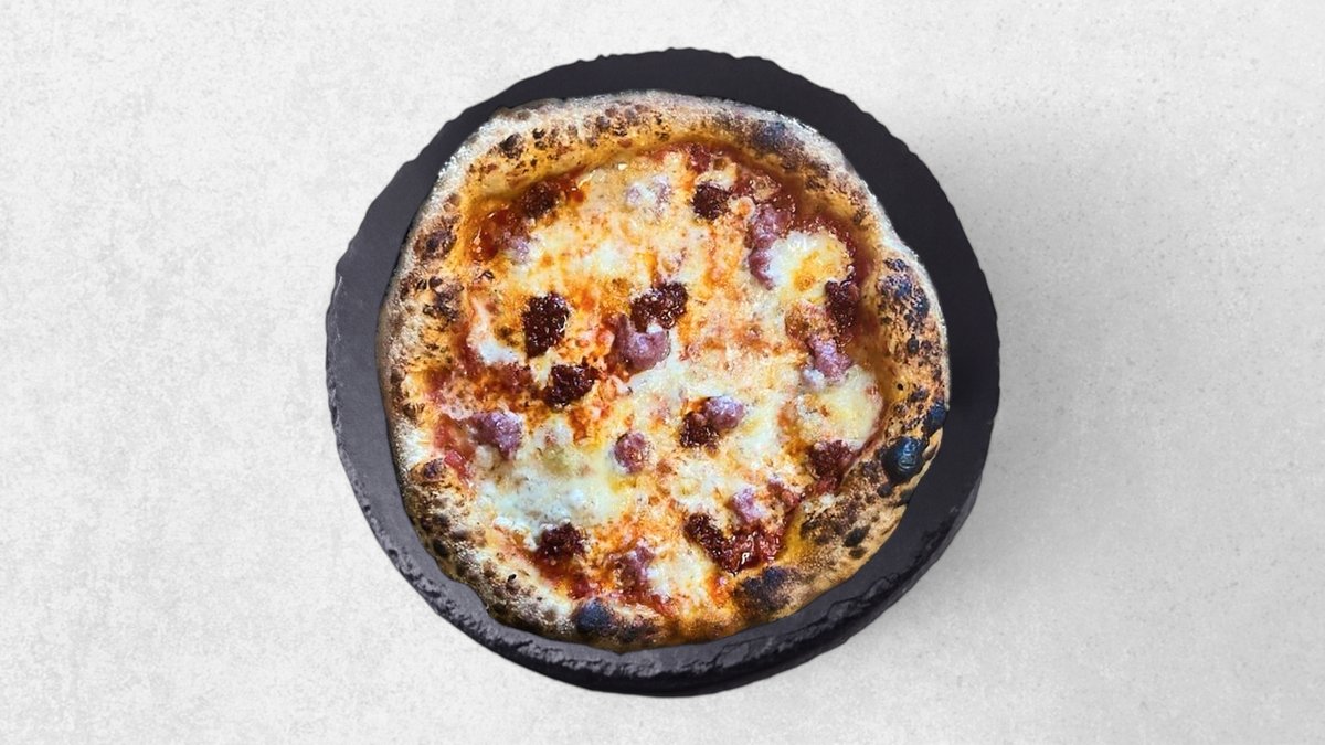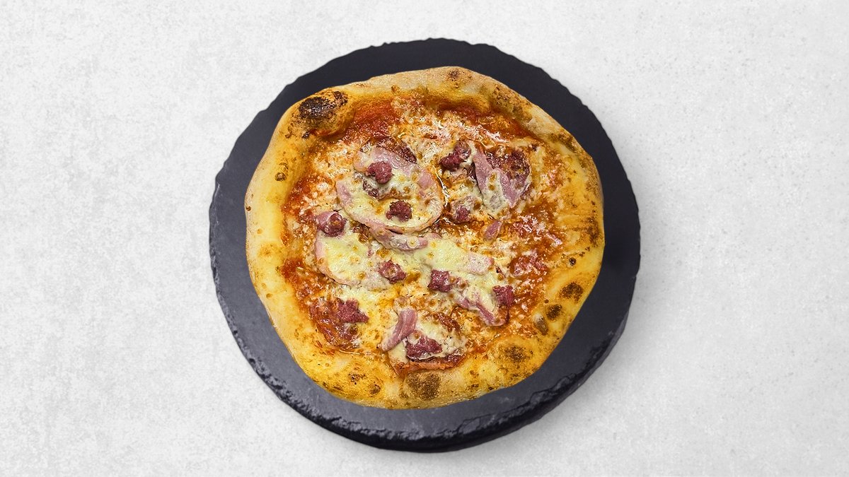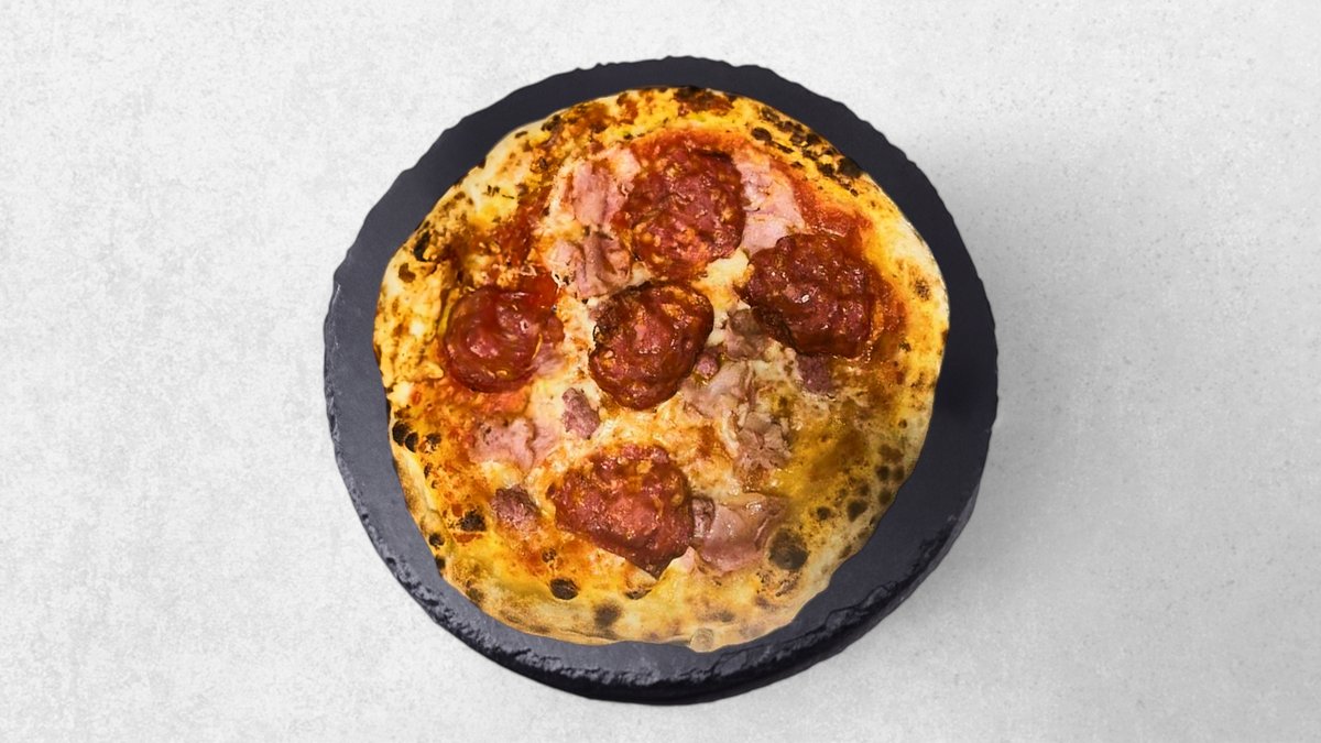 San Marzano Tomatsauce, FiorDiLatte Ost, Salame Napoli, Kogt skinke, Pancetta (italiensk bacon) og Salsiccia (italiensk pølse).