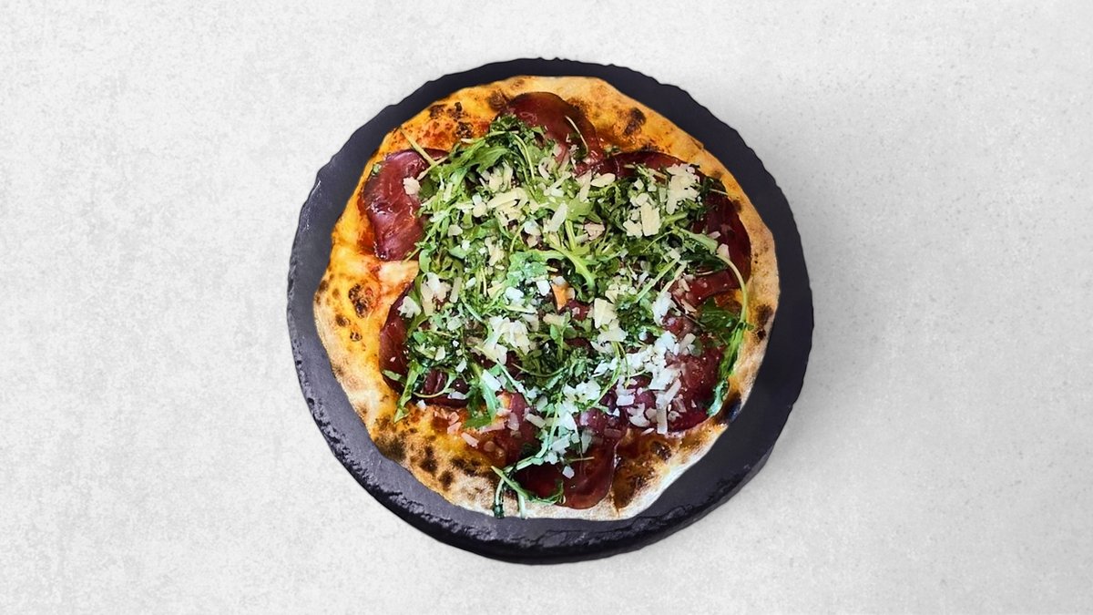 Tomatsauce, Mozzarella Ost, Bresaola, rukula og Grana Padano DOP