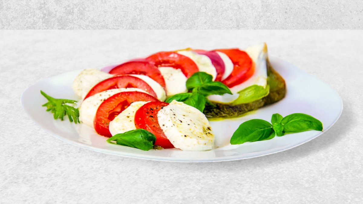 Ægte Italiensk salat med rukola. mozzarella, Cherry Tomater, Genovese pesto, basilikum, Balsamico Eddike.