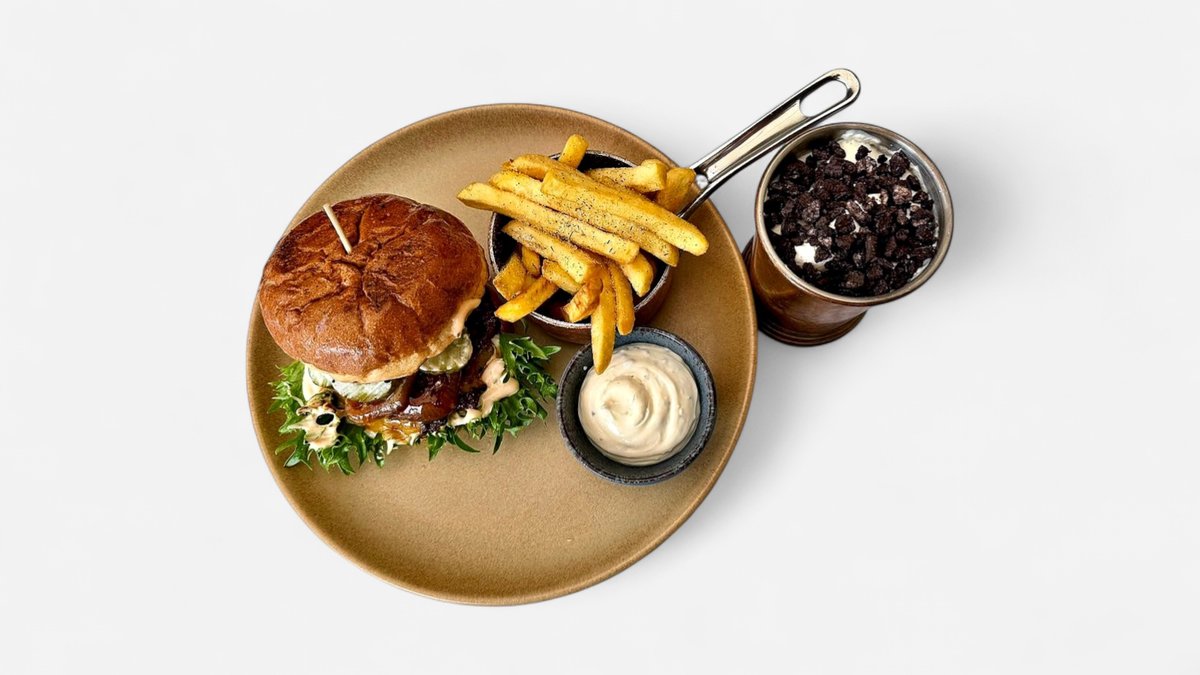 KLUBBENS SMASHBURGER Potato bun - oksebøf- cheddar - karamelliserede løg dild pickles - pommes frites - aioli OREO SUNDAE Chokoladeis - oreo ganache - vaniljeskum - oreo crumble SODAVAND 1 x valgfri 0,33 l sodavand.
