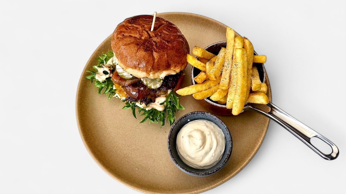 Potato bun - oksebøf- cheddar - karamelliserede løg dild pickles - pommes frites - aioli
