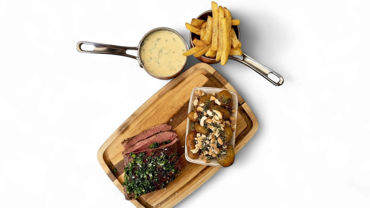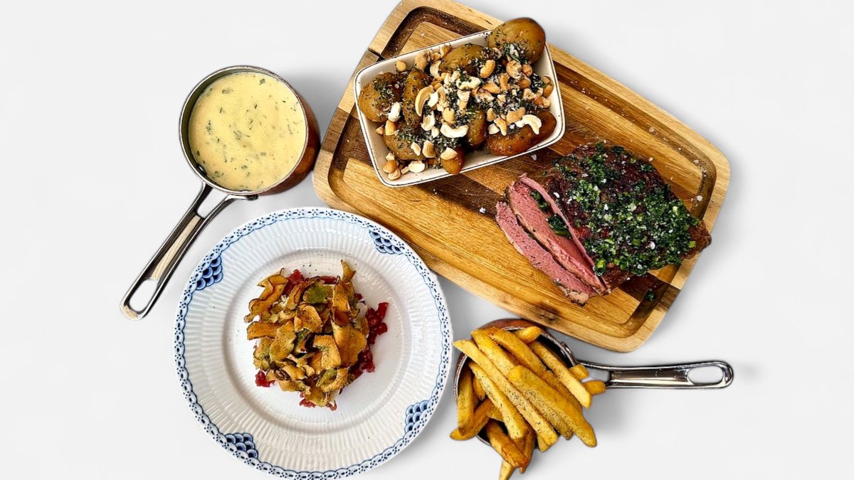 Langtidsstegt oksecuvette - honningbagte jordskokker - cashews pommes frittes - hjemmelavet bearnaise