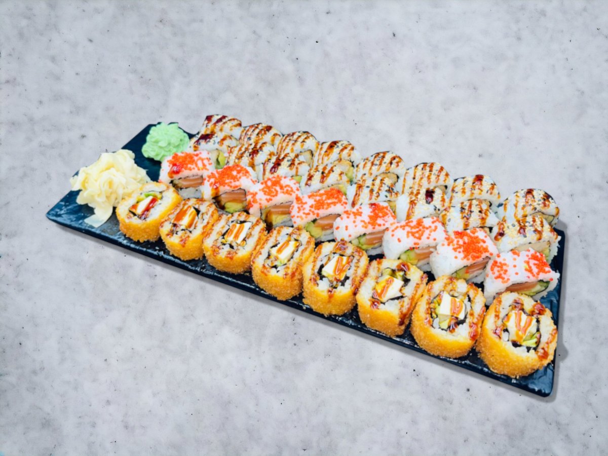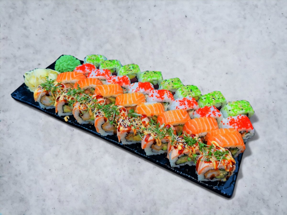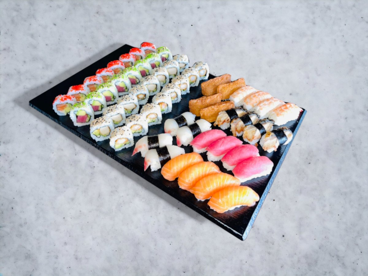 Nigiri: 4 x Laks 4 x Laks Tataki 4 x Tun 4 x Rejer Hosomaki: 8 x Laks 8 Agurk Inside Out: 8 x Kylling Toppet Uramaki: 8 x Rainbow 8 x New York 8 x Oyisi Futomaki: 12 x Tempura Laks