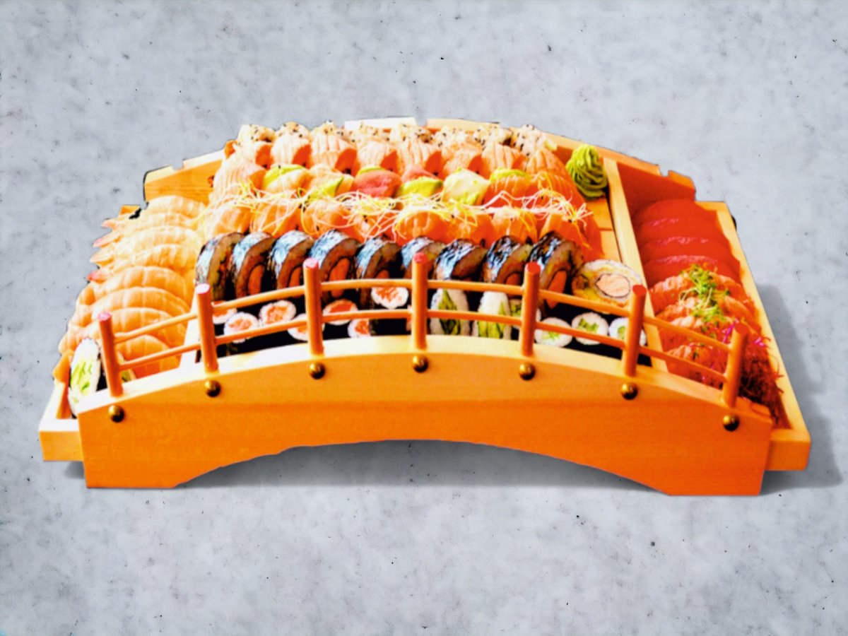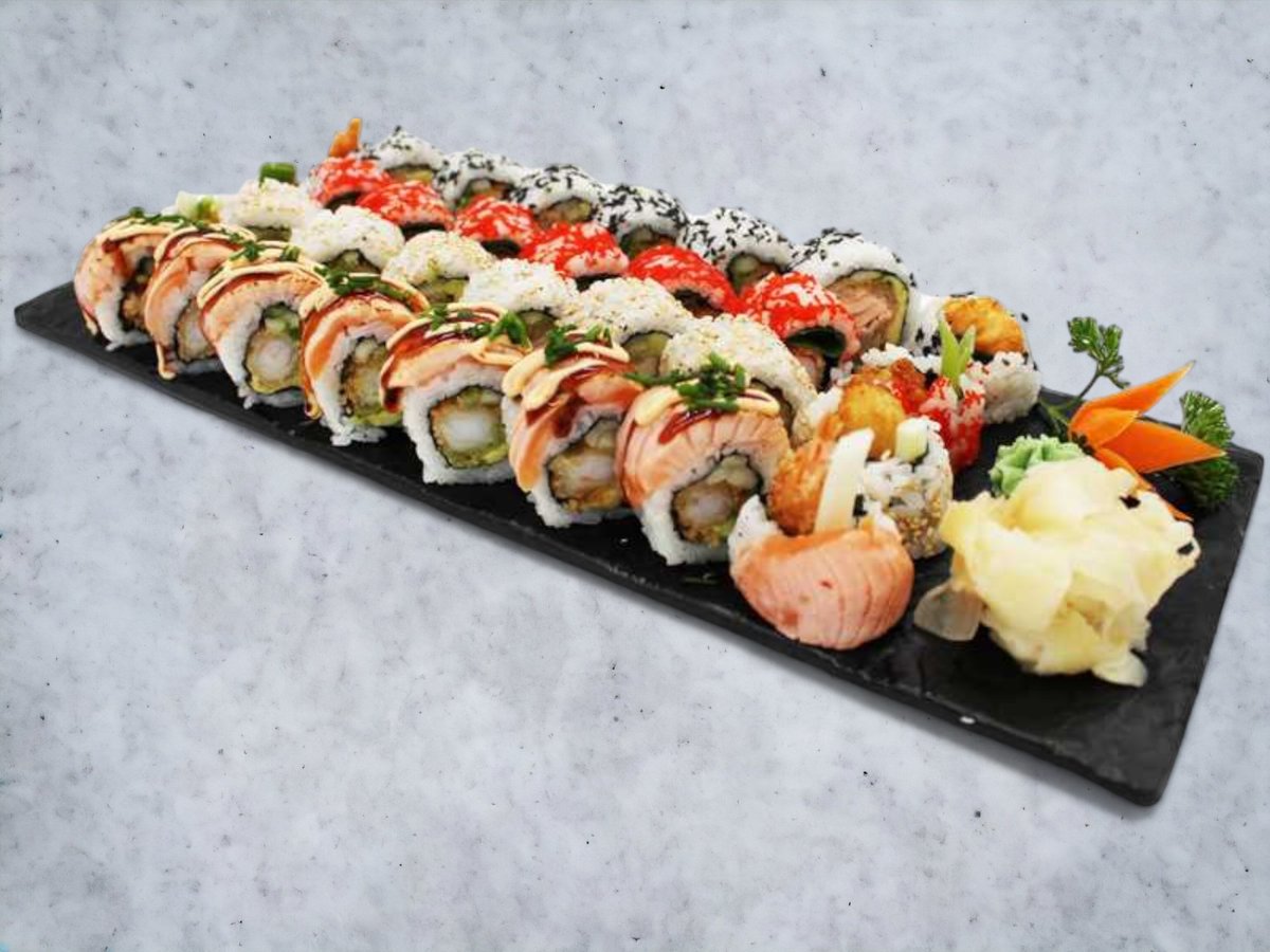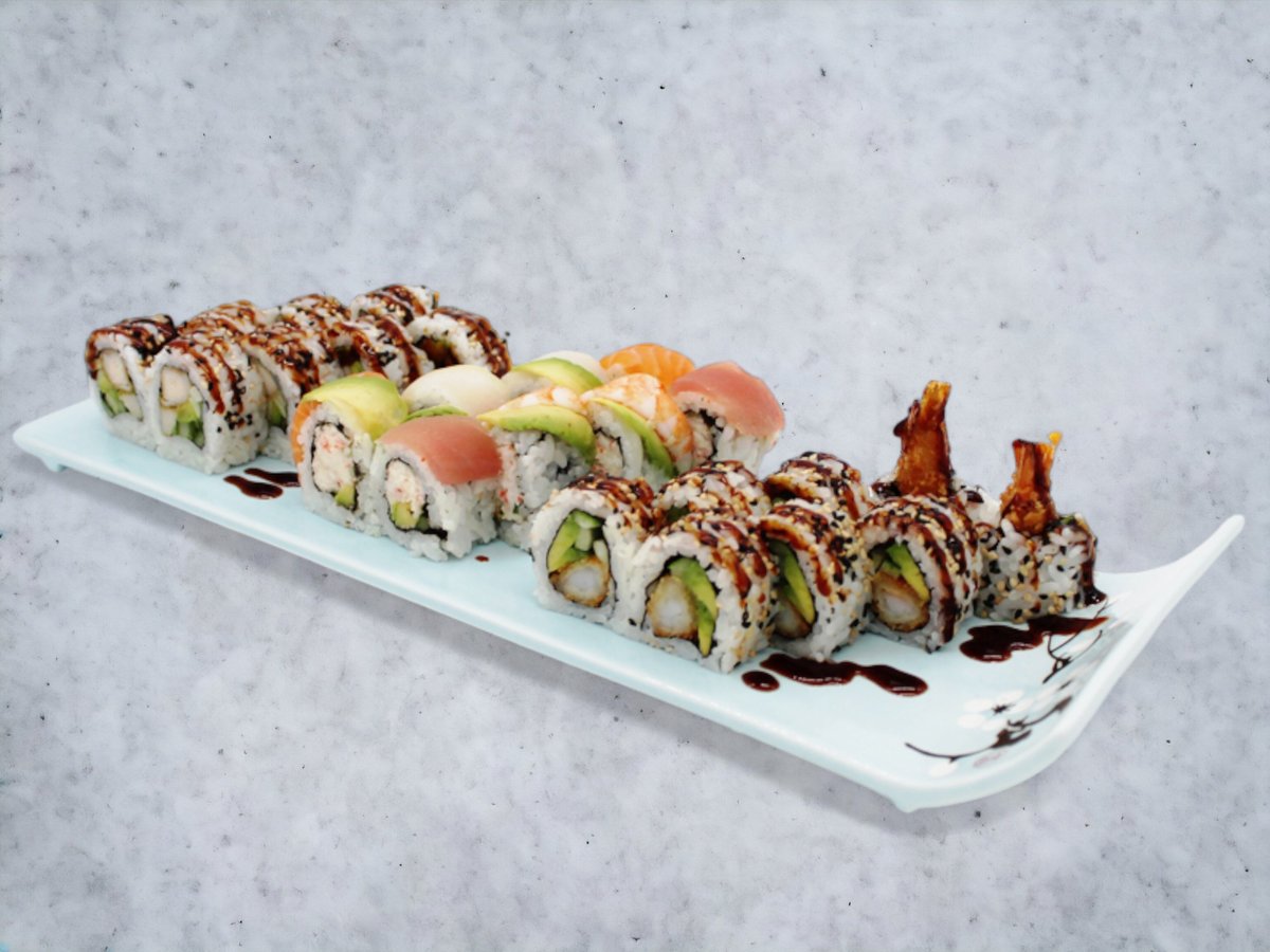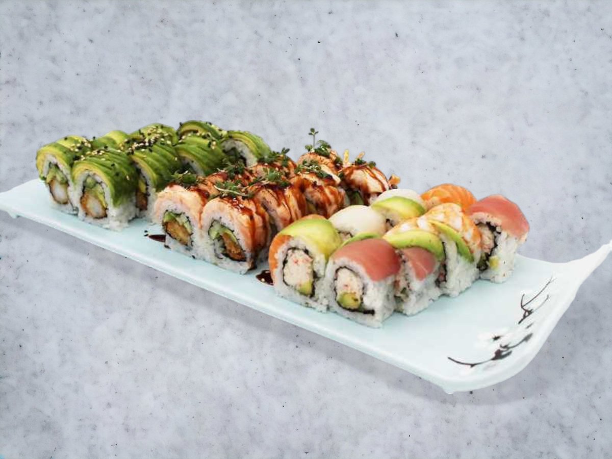 Nigiri: 4 x Laks 4 x Laks Tataki 4 x Tun 4 x Rejer Hosomaki: 8 x Laks 8 Agurk Inside Out: 8 x Kylling Toppet Uramaki: 8 x Rainbow 8 x New York 8 x Oyisi Futomaki: 12 x Tempura Laks