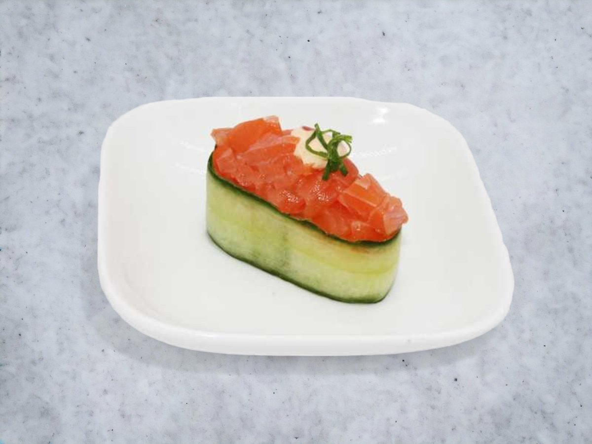 Surimi chunk og agurk. Toppes med rejer, laks, tun, hvidfisk, og avocado.