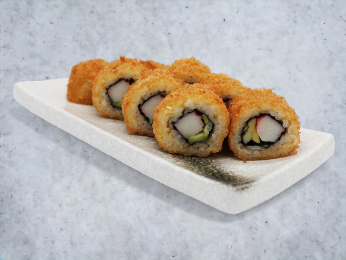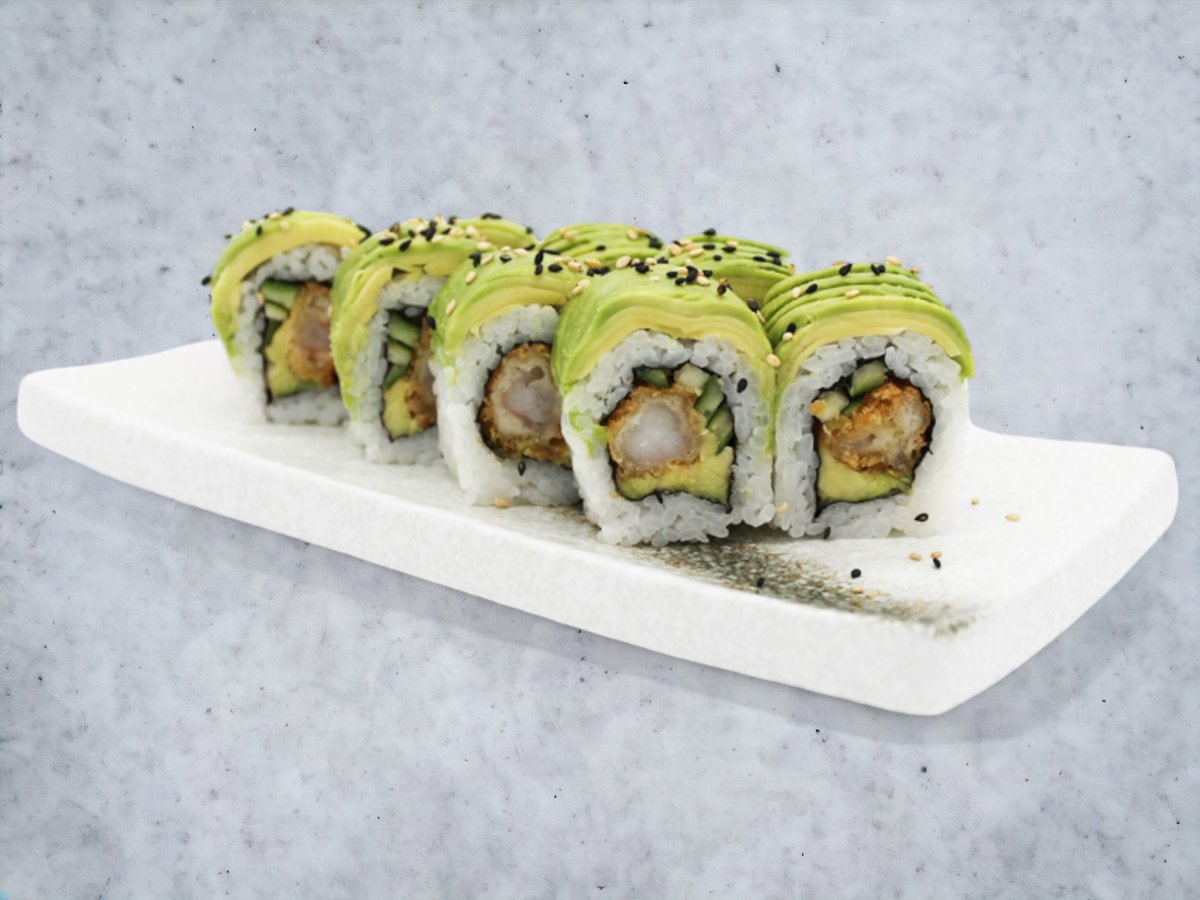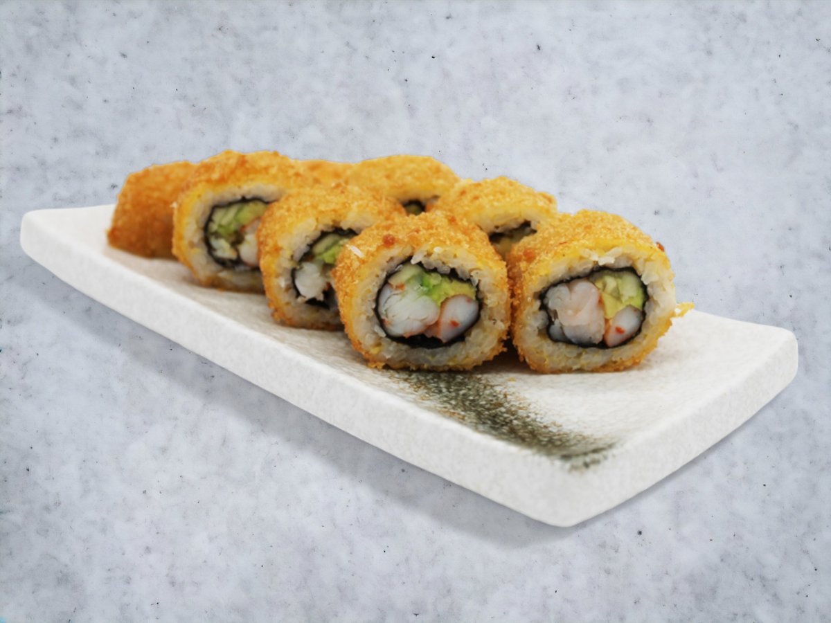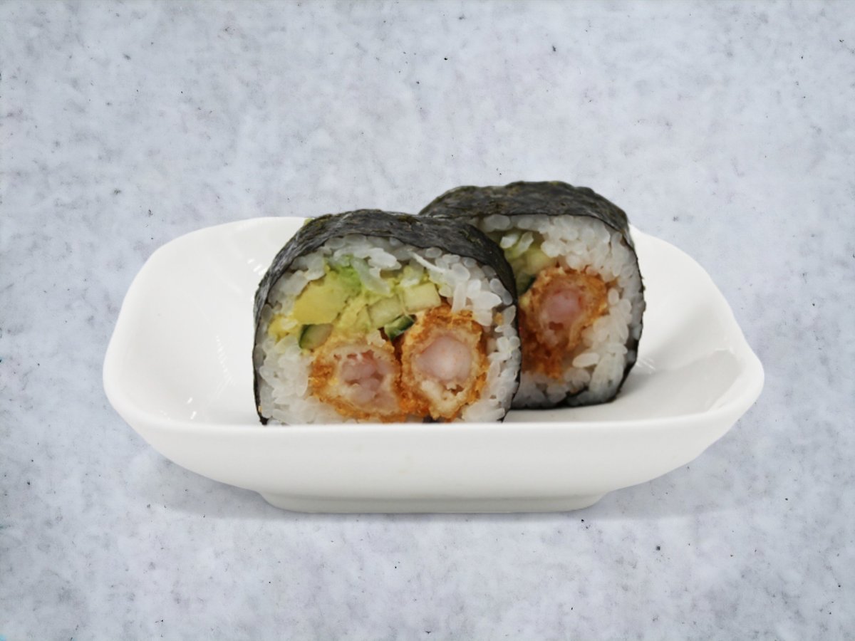 Dybstegt panerede rejer, avocado, agurk, teriyaki og sesam.
