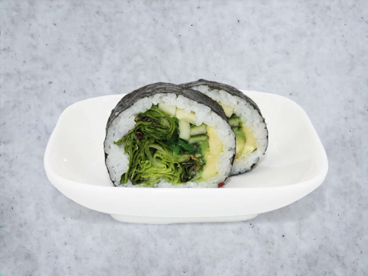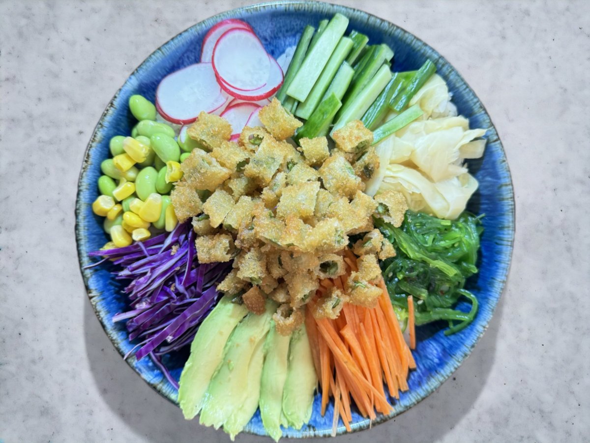 Tofu, avocado, gulerødder, ingefær rødkål, majs, tangsalat, radise, edamame bønner, agurk og sesam. Toppes med japansk dressing og chilimayo.