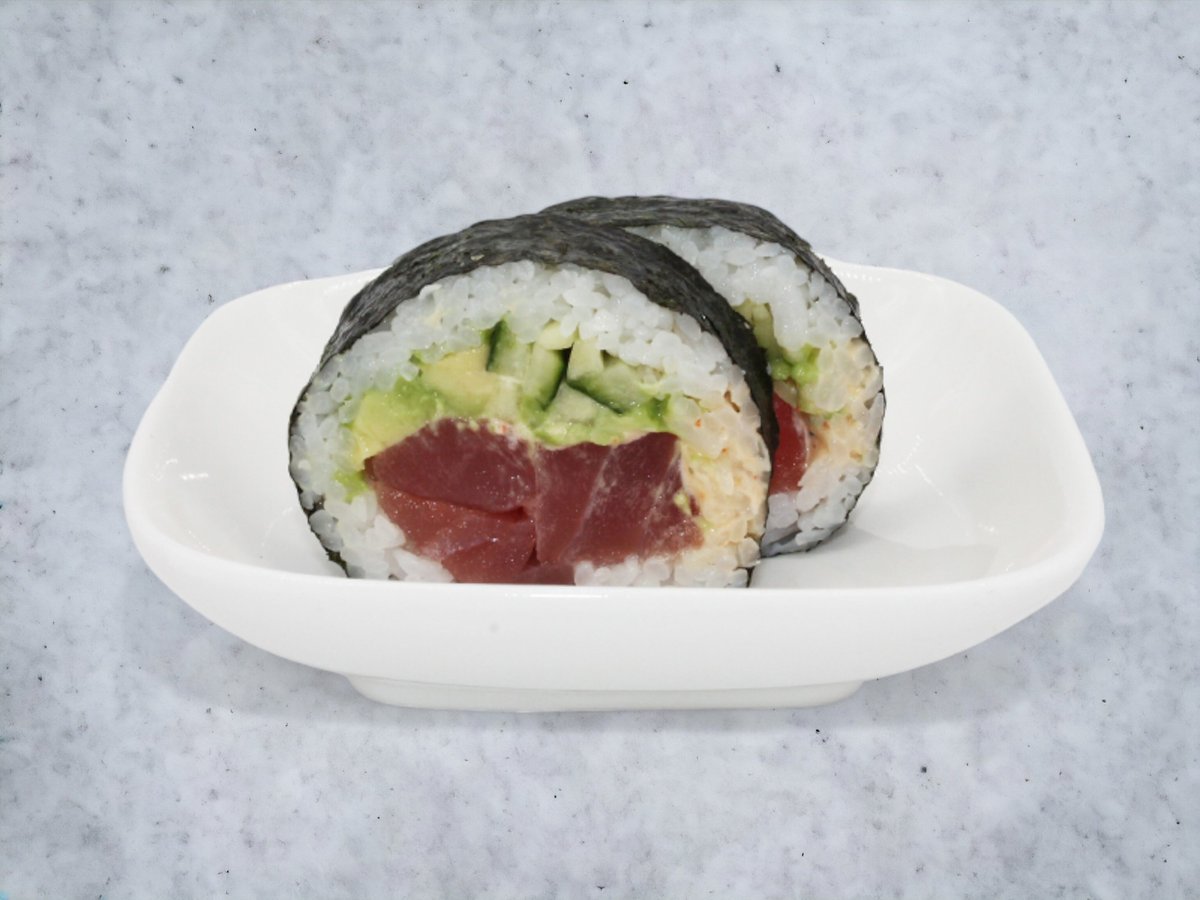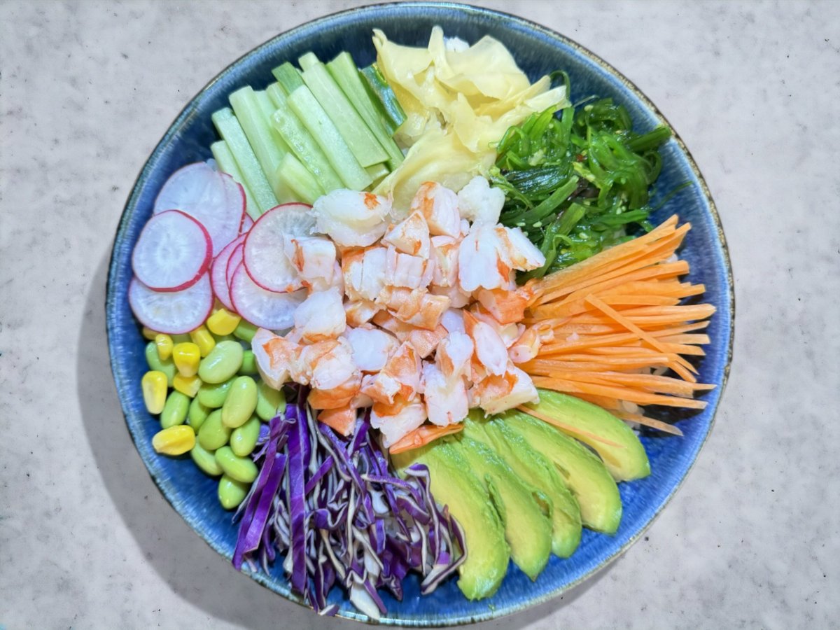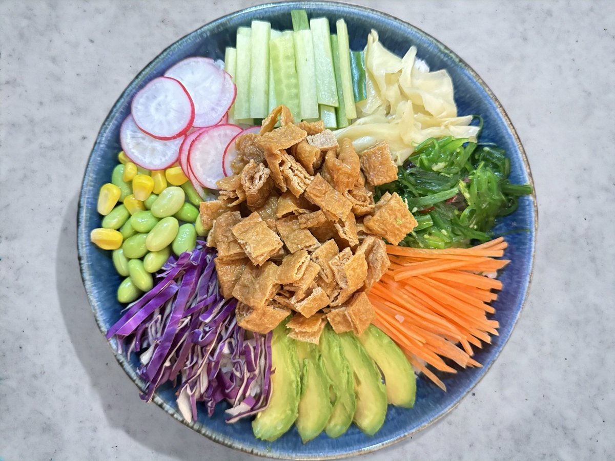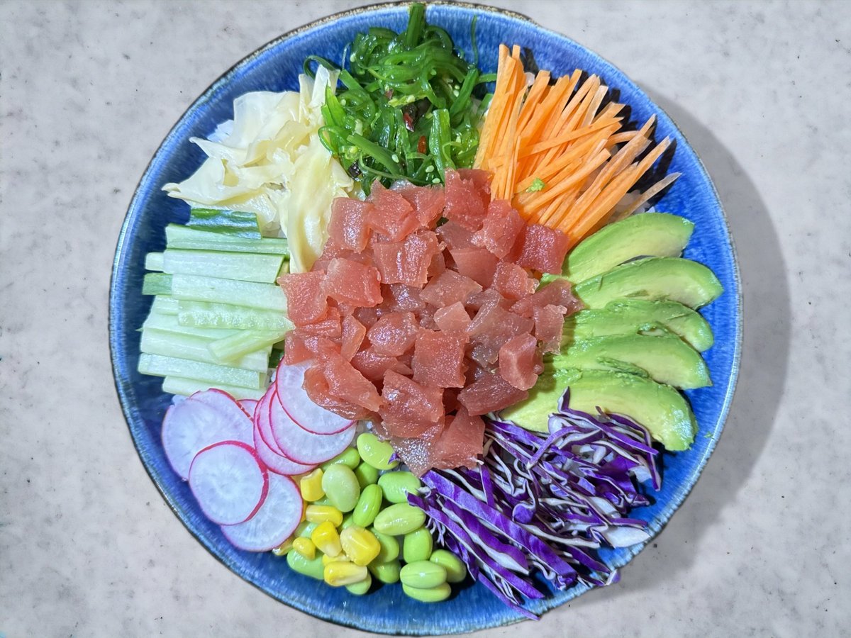 Tun, gulerødder, ingefær, edamame bønner, majs, radise, agurk, rødkål, tangsalat, avocado og sesam. Toppes med japansk dressing og chilimayo.