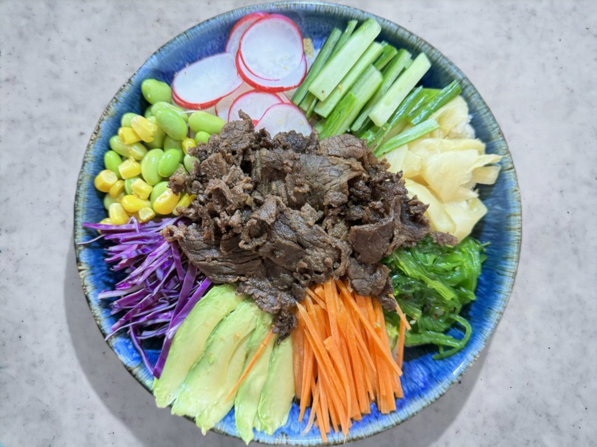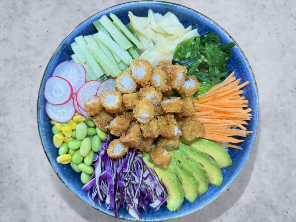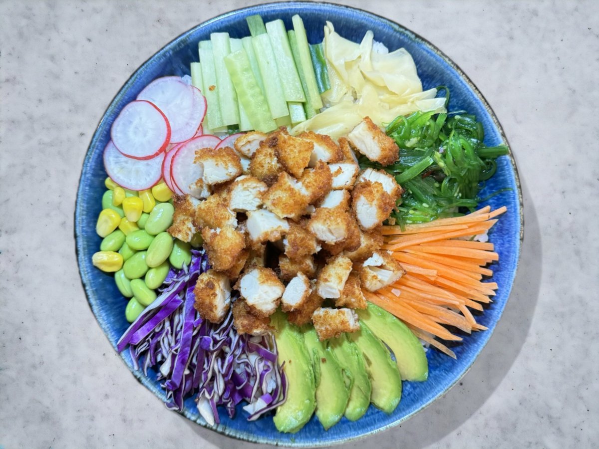Dybstegt kylling, gulerødder, avocado, rødkål, ingefær, majs, tangsalat, radise, edamame bønner, sesam og agurk. Toppes med japansk dressing og chilimayo.