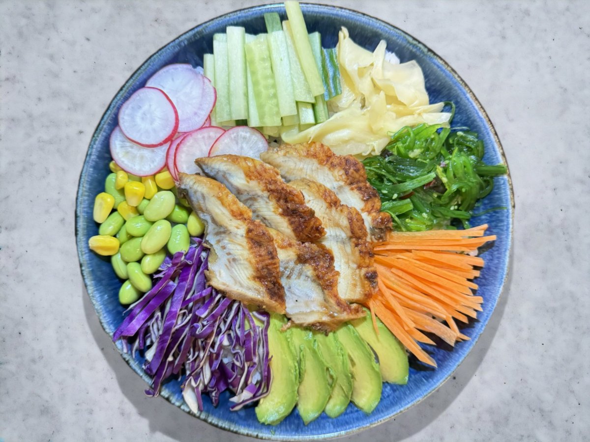 Ål, gulerødder, ingefær, edamame bønner, majs, radise, agurk, rødkål, tangsalat, avocado og sesam. Toppes med japansk dressing og chilimayo.