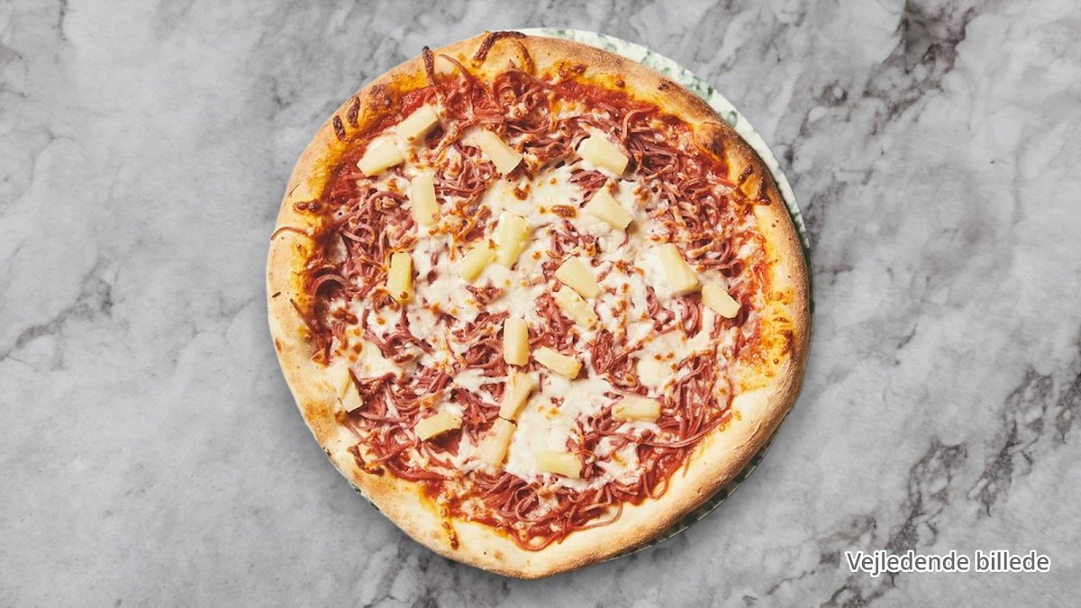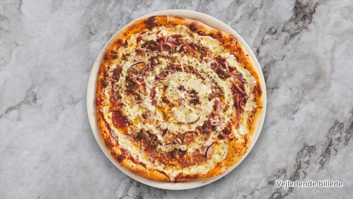 Tomatsauce, ost, oksekød og pepperoni. Serveres med friske grøntsager.