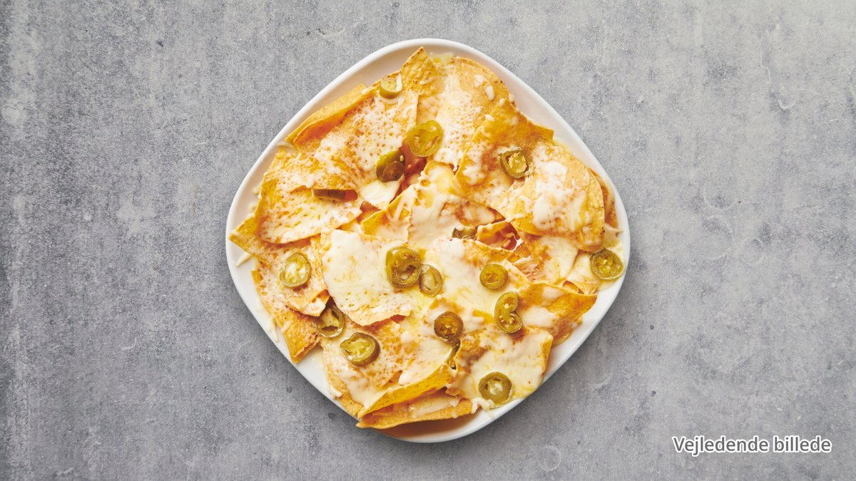 Sprøde tortilla chips toppet med cheddar, mozzarella og harvarti. Serveres med salsa og creme fraiche.
