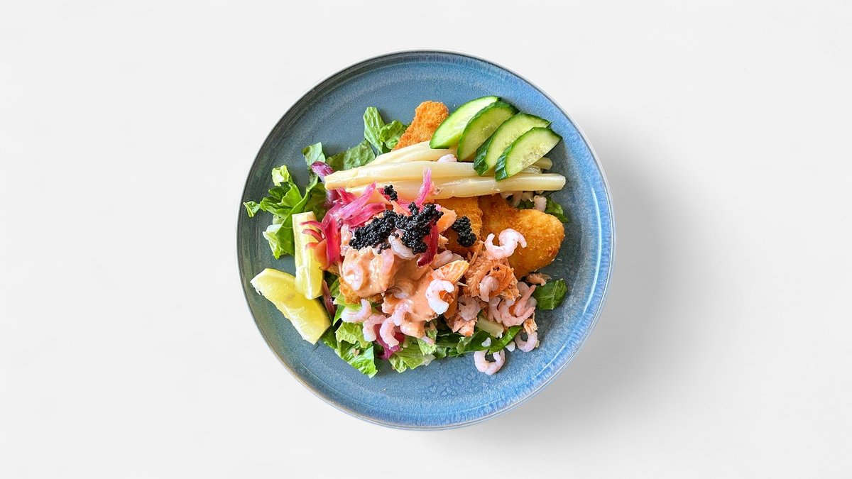 Stegte rødspættefileter, varmrøget laks, rejer, asparges, syltede rødløg, agurk & citron
