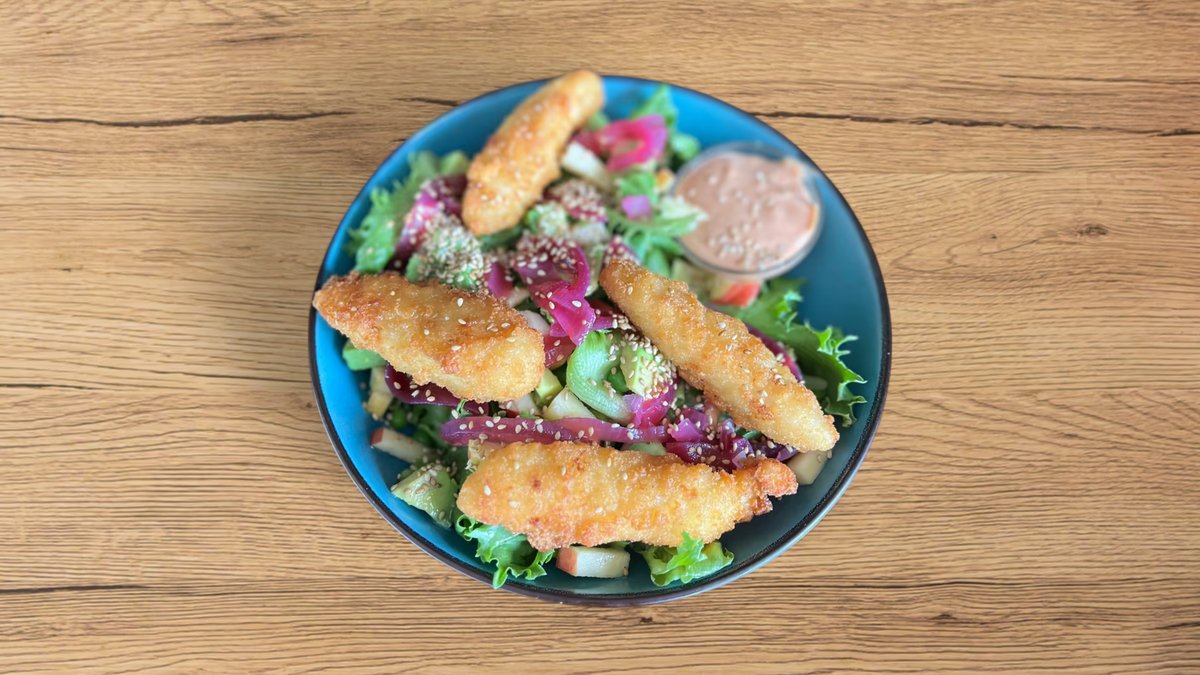Stegt crispy kylling, sprød salat, æble, ærter, avocado, syltede rødløg, ristede sesamfrø, citron vinaigrette & tomatmayo