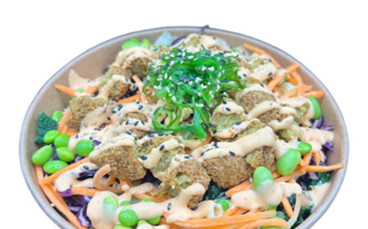 Sushi ris, spidskålsmix, revet gulerod, edamame bønner, agurk, falafel, tangsalat, sesamfrø, hjemmelavet vegansk chilimayo og teriyaki.