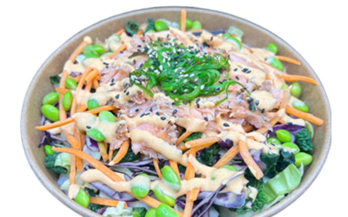 Sushi ris, spidskålsmix, revet gulerod, edamame bønner, agurk, varmrøget laks, tangsalat, sesamfrø, hjemmelavet vegansk chilimayo og teriyaki.
