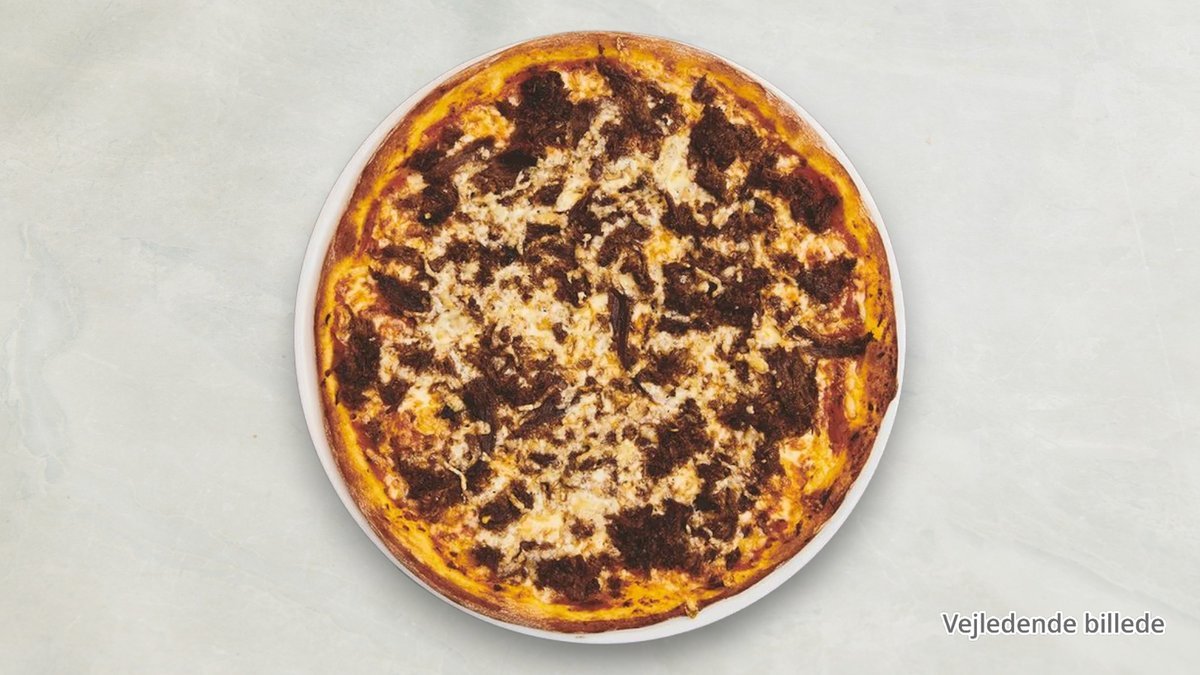 Tomatsauce, ost, oksekød, feta, oliven, løg og tomatskiver.