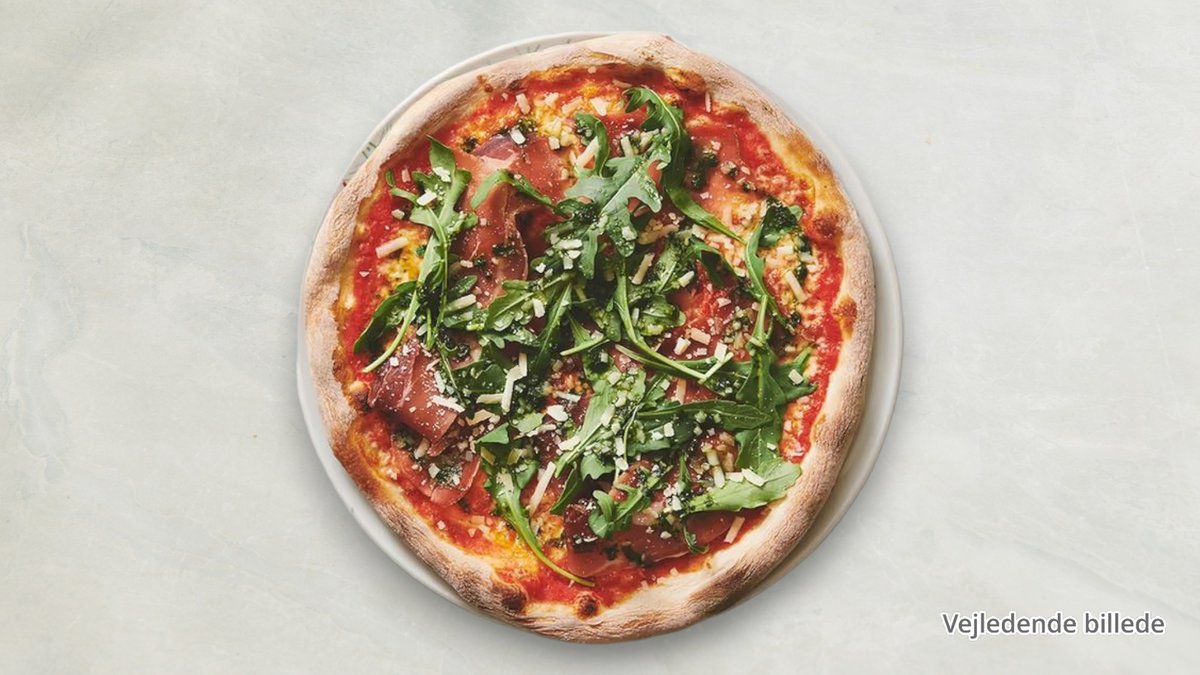 Tomatsauce, ost, lufttørret skinke, mozzarella, pesto, ruccola, tomat og parmesan.