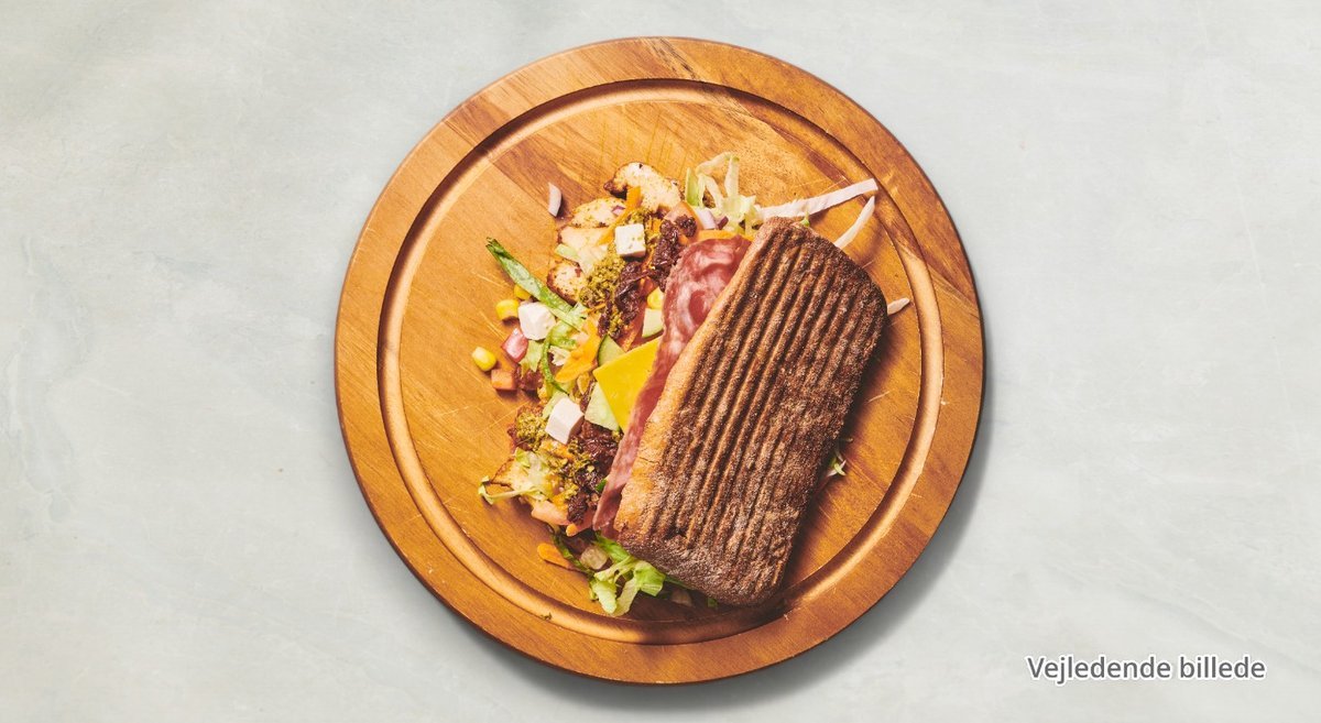Smøres med mayo og fyldes med iceberg, rucola,agurk, tomat og rødløg
